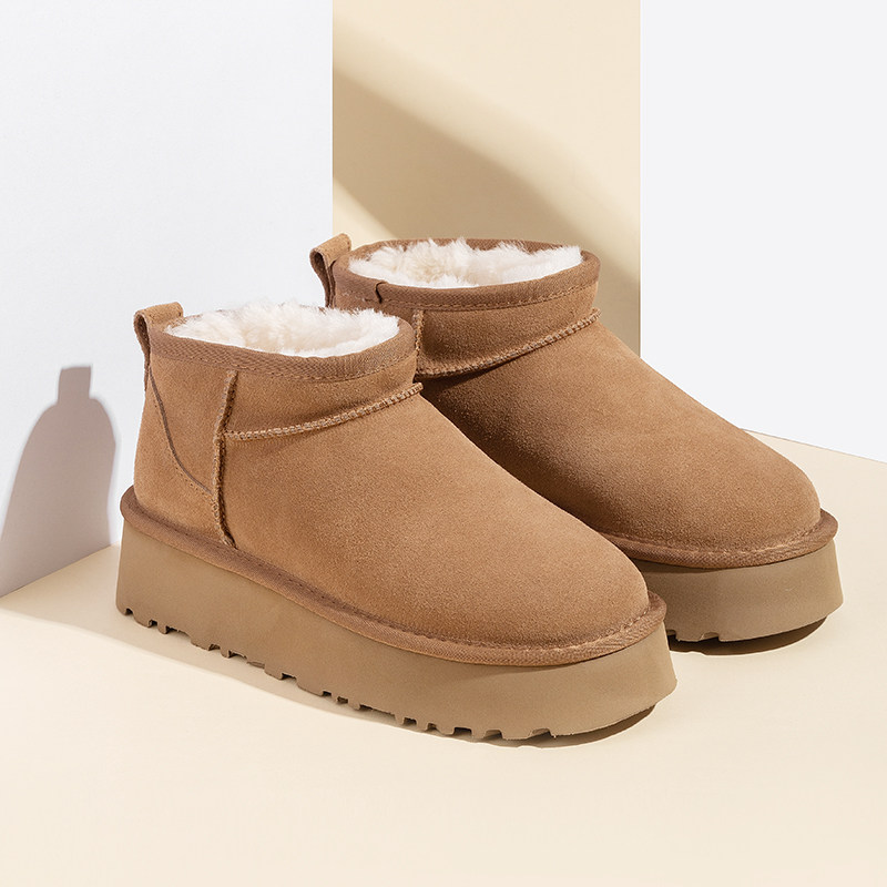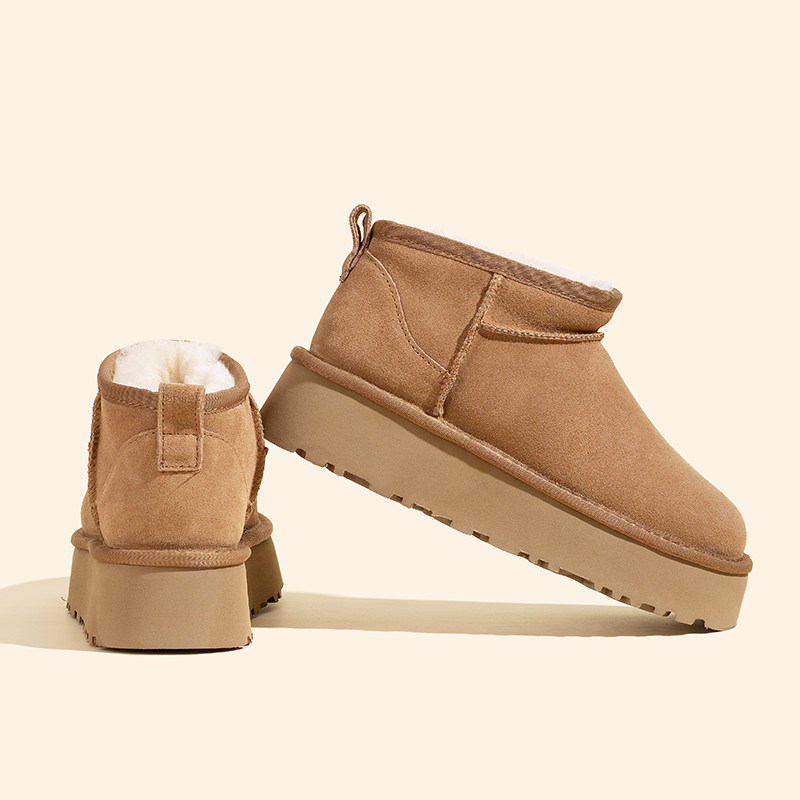 淘miu家厚底雪地靴女冬季真皮短靴羊毛侧拉链增高厚底加绒毛毛棉鞋