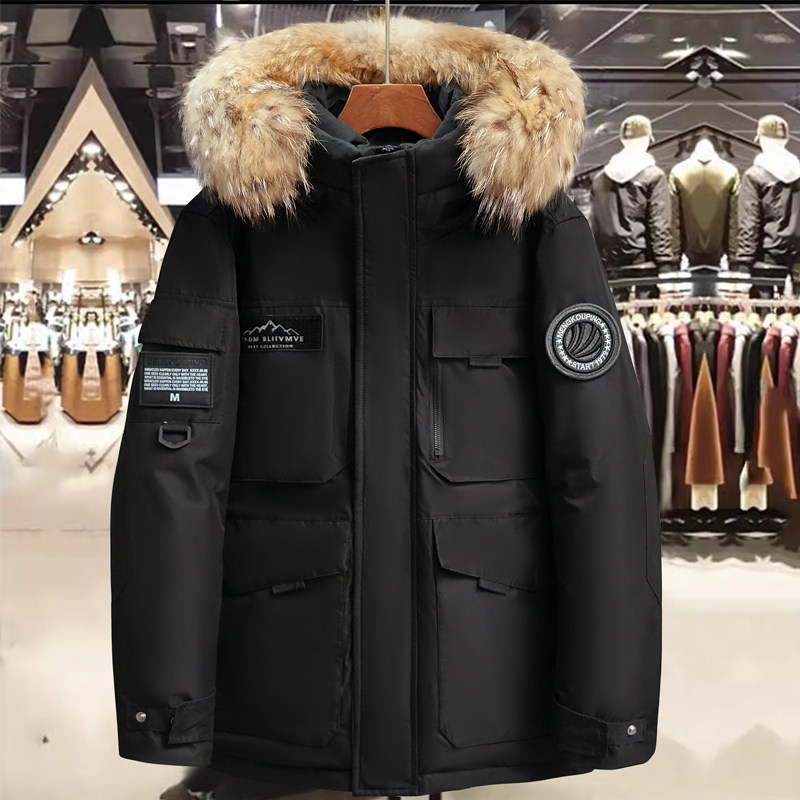 淘冬季新款男士高端字母印花加厚连帽鸭绒羽绒服潮牌工装保暖外套潮