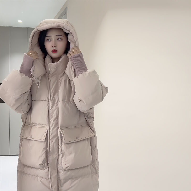 天猫90白鸭绒大口袋螺纹袖连帽羽绒服女长款2025年冬季新款保暖外套潮