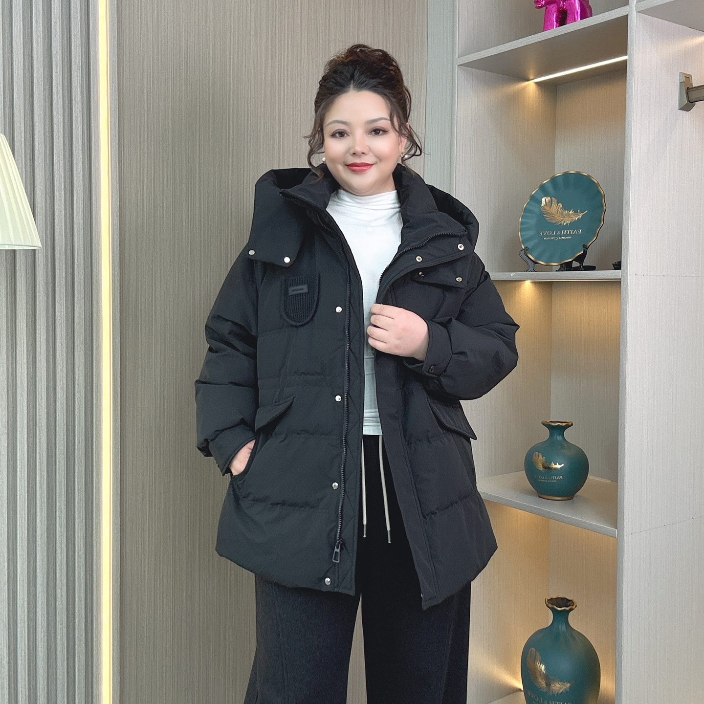 时尚少女抽绳收腰御寒外套胖莹莹大码女装胖mm冬装连帽保暖羽绒服