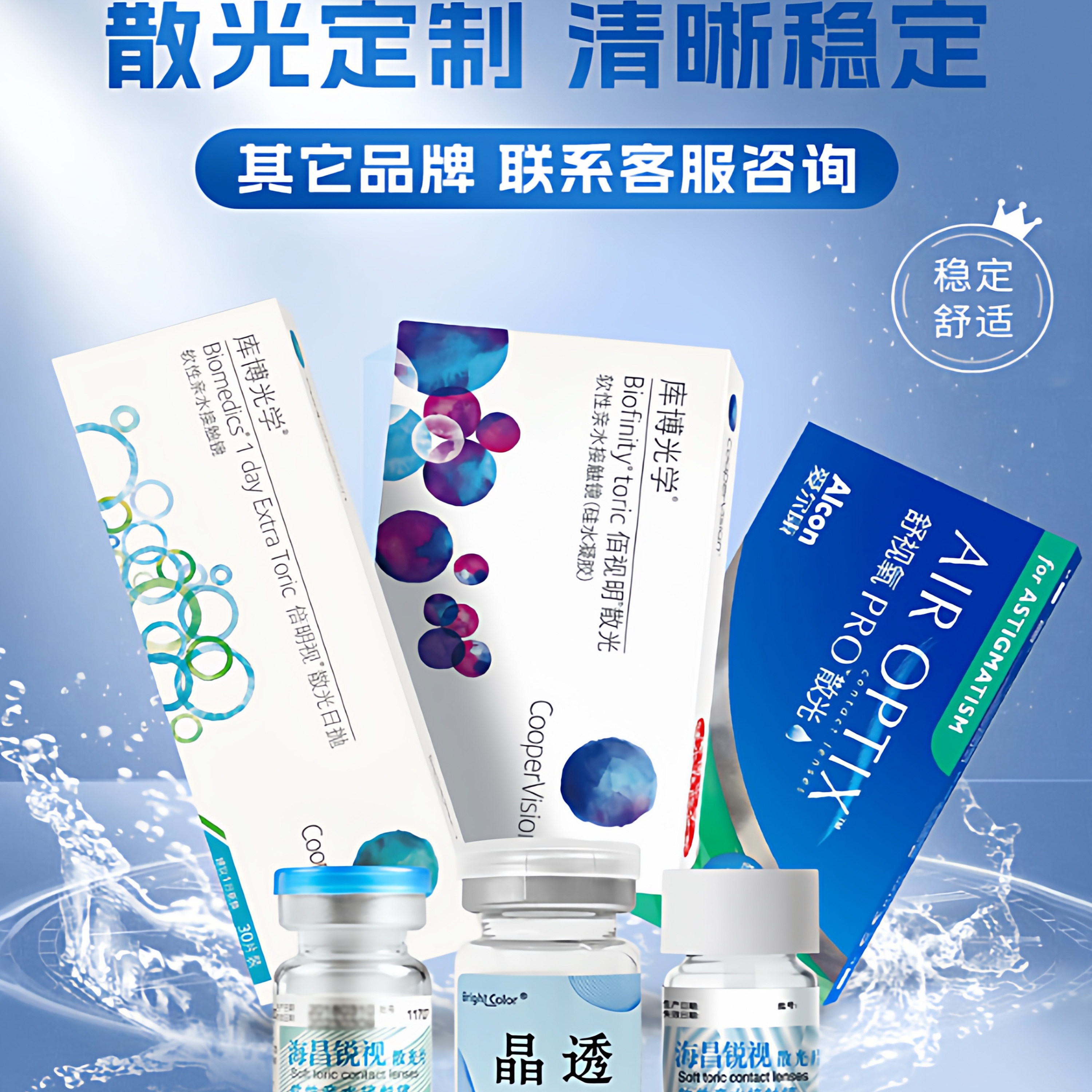 散光定制日抛、月抛及半年抛硅水凝胶高度数散光隐形眼镜,专为复杂视力需求人群设计。采用高透氧硅水凝胶材质,佩戴舒适,有效缓解眼干。精准定制散光轴位与度数,结合高度近视矫正,提供清晰稳定的视觉体验。日抛型卫生便捷,月抛兼顾性价比与舒适,半年抛经济耐用,满足不同使用习惯。镜片稳定设计防止旋转,确保散光矫正精准。适用于长时间用眼者,如办公、学习及户外活动。TF系列注重眼部健康与视觉品质,是高度散光与近视患者的理想选择,建议在专业验光师指导下选配,保障佩戴安全与效果。