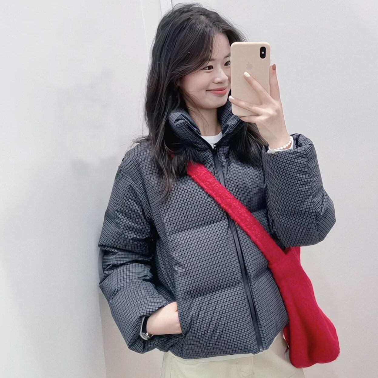 DM100大码百分百女装微胖mm秋季保暖方格立领短款云感羽绒服外套