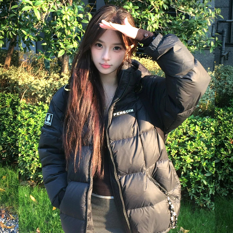 大码百分百女装微胖mm冬季甜美撞色翻领宽松直筒羽绒服外套