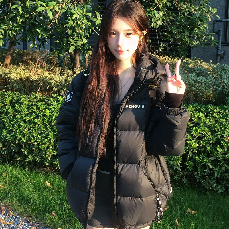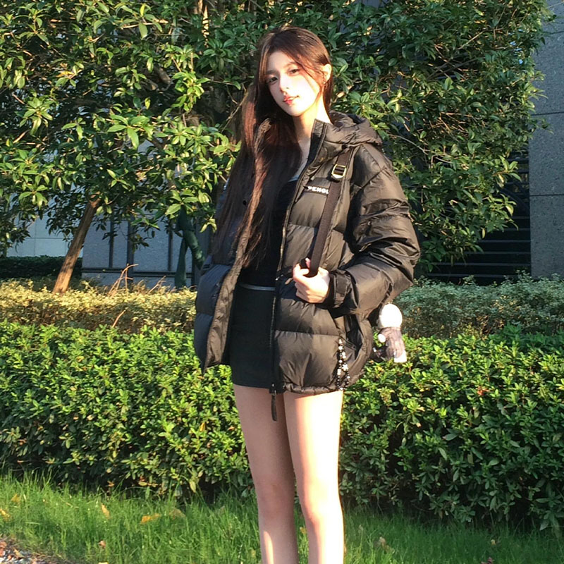 天90白鸭绒大口袋螺纹袖连帽羽绒服女长款2025年冬季新款保暖外套潮