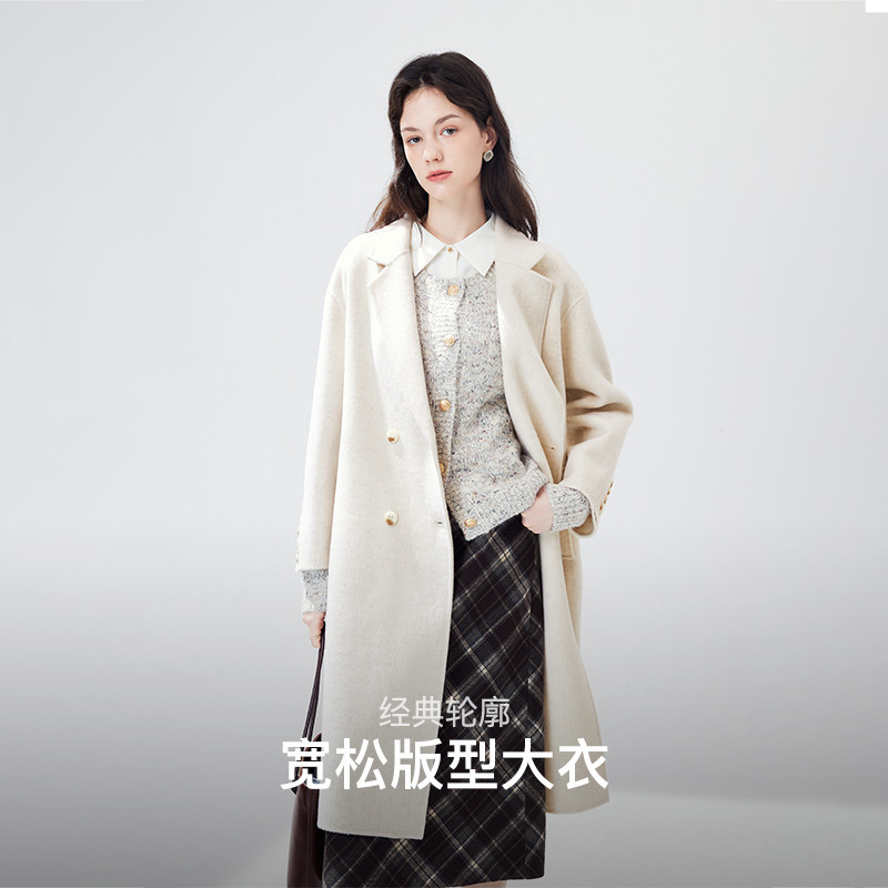 天猫秋水伊人100%绵羊毛气质大衣2025年冬季新款女装直筒中长西装外套