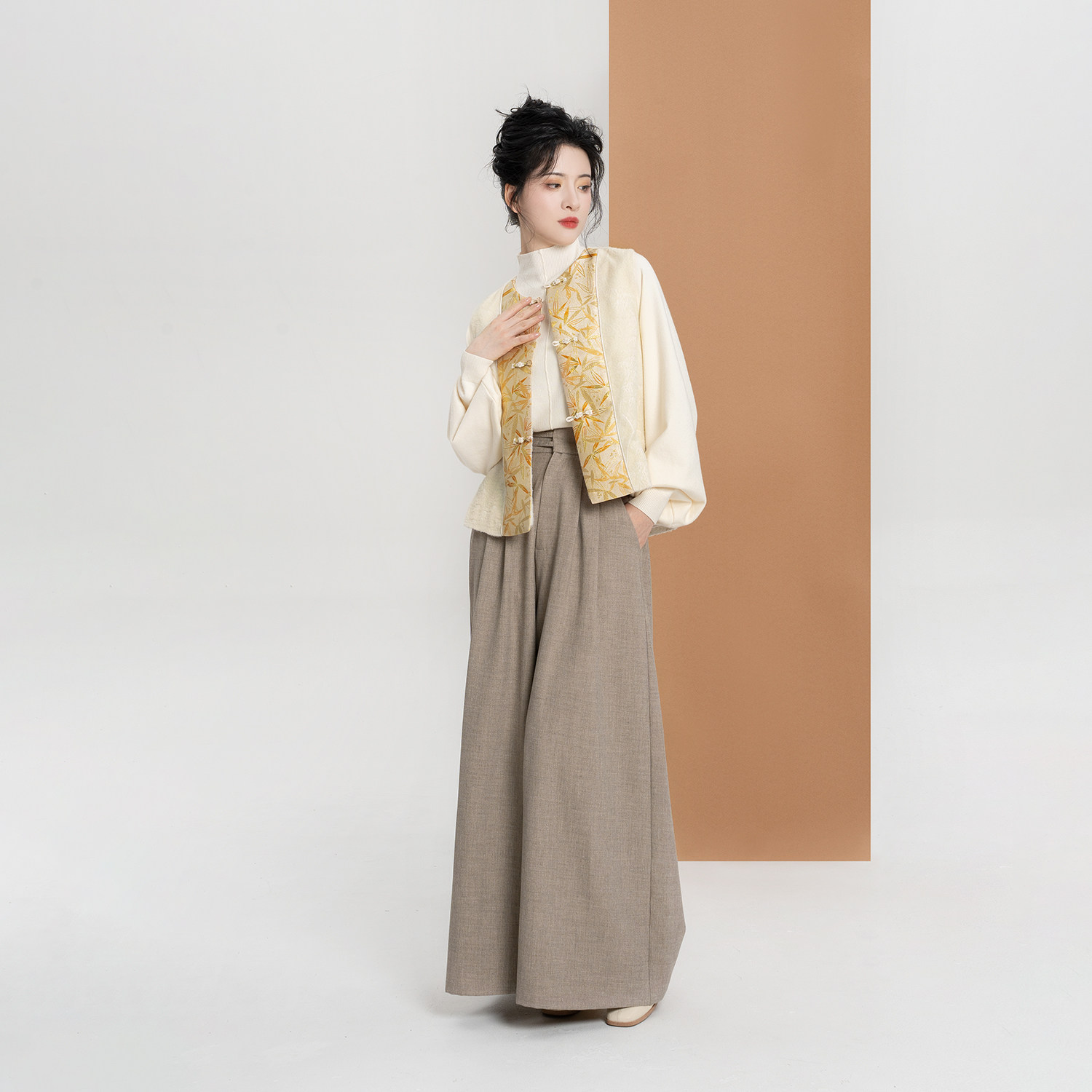 淘宝织造司[金枝竹]新中式国风圆领对襟马甲竹纹妆花上衣西装阔腿裤女