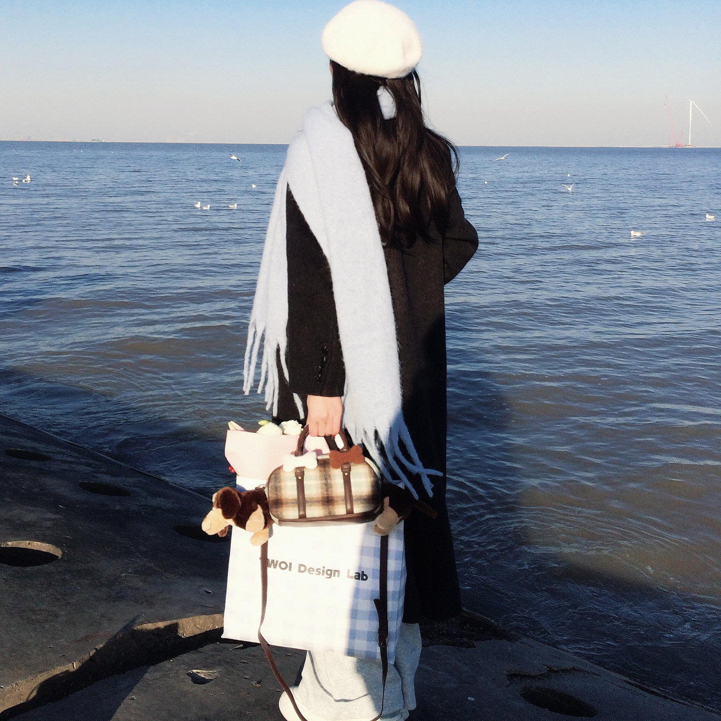 淘虞书欣同款高品质马海毛围巾女百搭蓝色秋冬加厚保暖格子披肩围脖