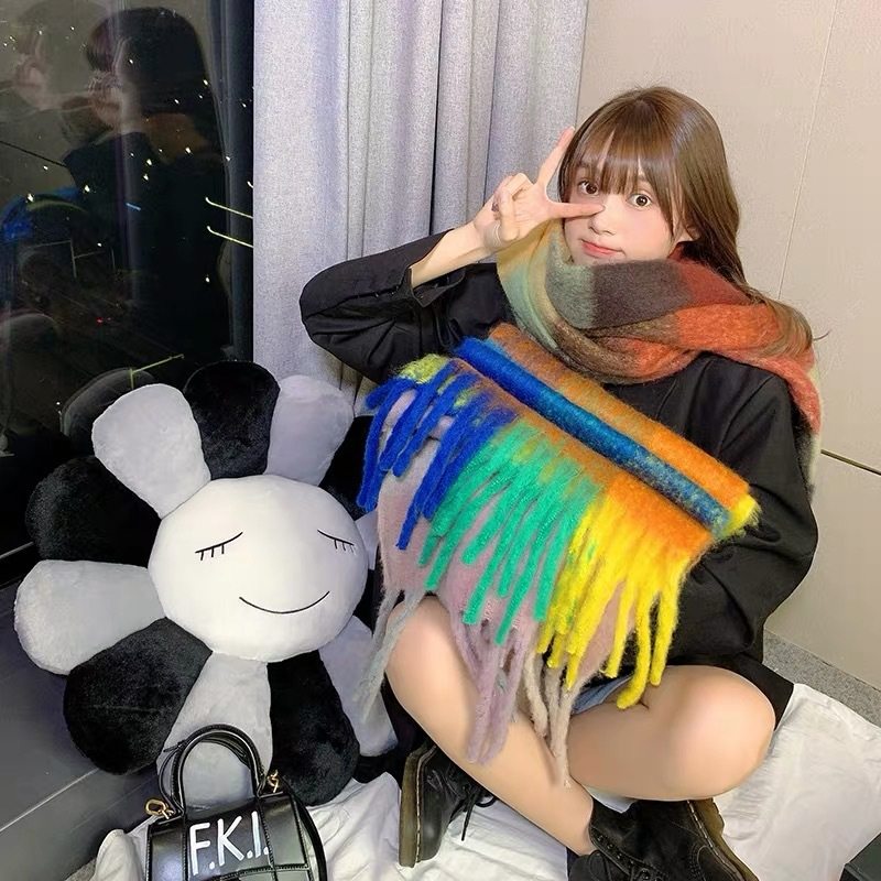 这款韩版AC彩虹格子围巾,专为秋冬时尚女性打造,采用仿羊绒与马海毛混纺材质,触感柔软亲肤,保暖性极佳。经典彩虹拼色设计搭配复古格子元素,色彩丰富却不失高级感,轻松点亮沉闷冬日穿搭。流苏边饰增添灵动气息,披肩式宽大版型可随意围裹,既能作为围脖保暖,也能当作时尚披肩,一物多用。加厚设计兼顾温度与风度,无论是搭配大衣、毛衣还是羽绒服,都能轻松凹出潮流造型,是秋冬季节的百搭单品,尽显韩系优雅与街头时尚感。