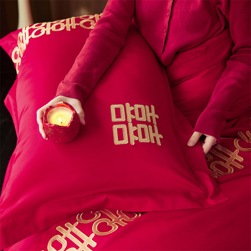 天轻奢风婚庆四件套100S长绒棉纯棉提花被套高级感红色结婚床上用品
