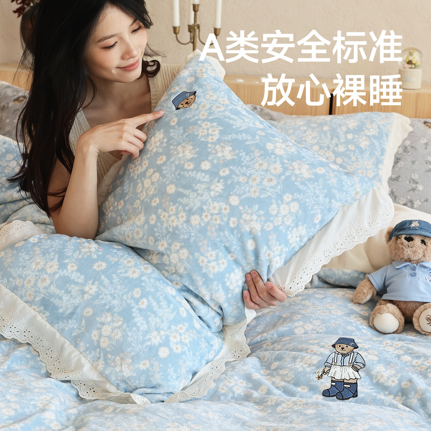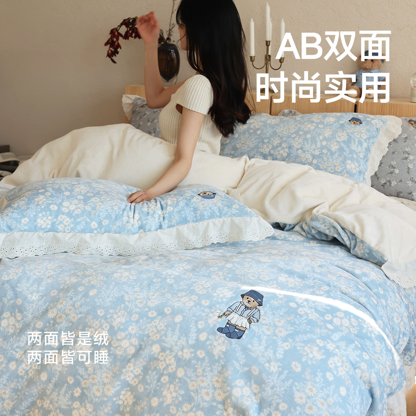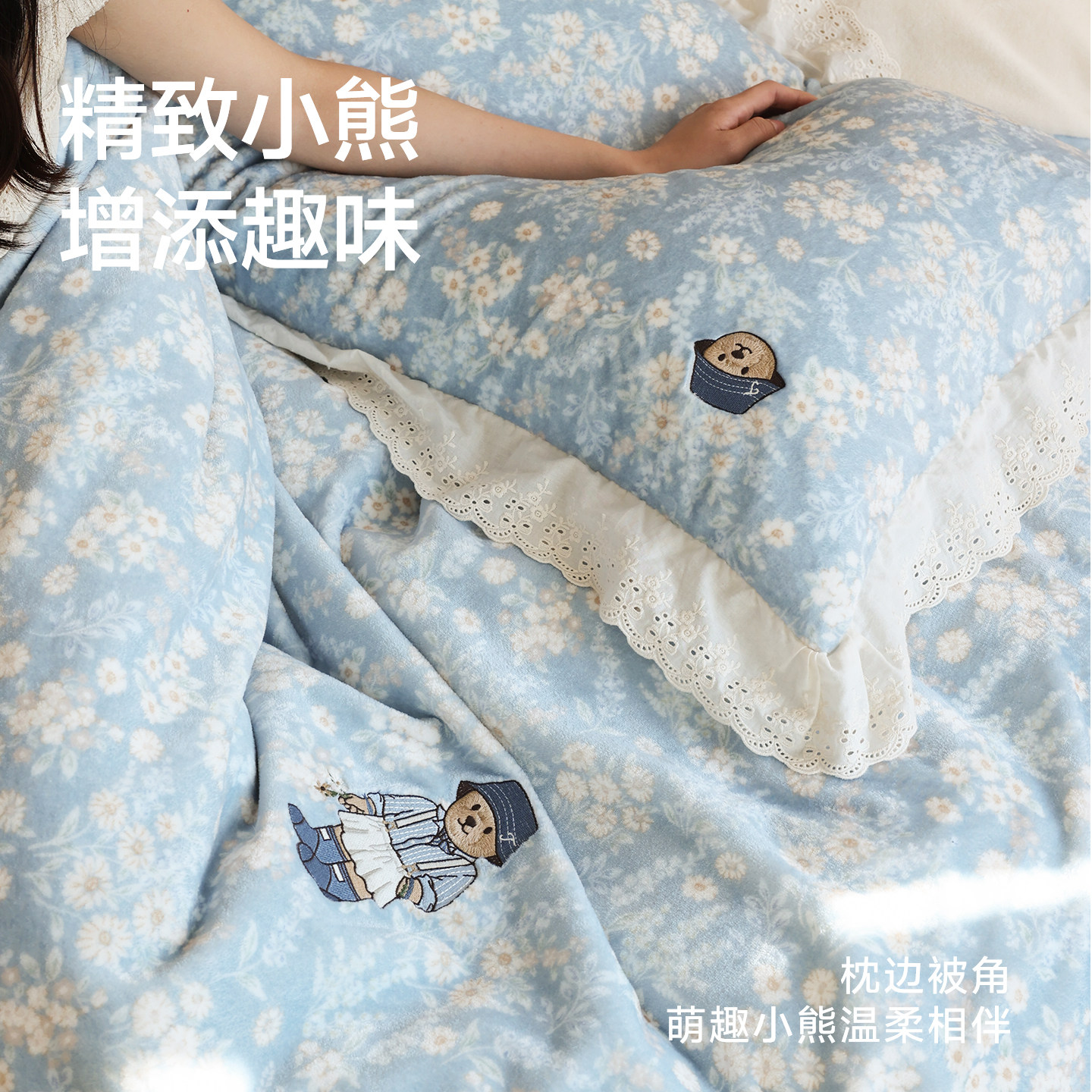 天猫TeenieWeenie淡蓝秋冬季保暖加厚小碎花牛奶绒四件套蕾丝花边被套