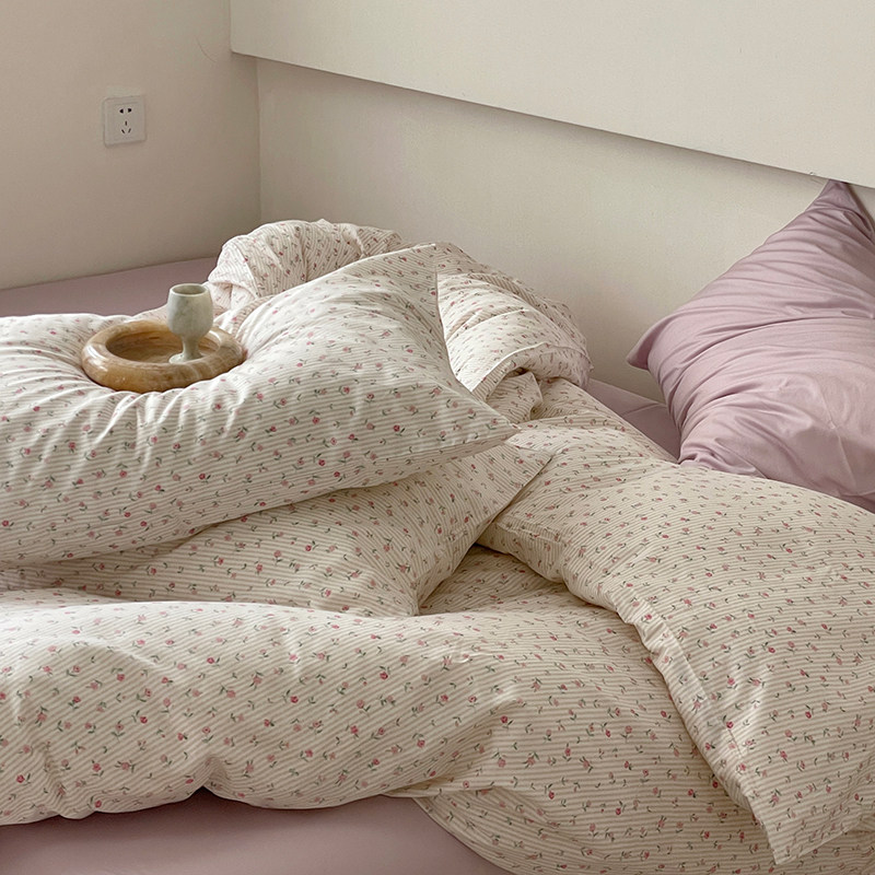 淘田园淡雅小碎花米白床裙床上四件套全棉1.5m1.8米被套床单三件套