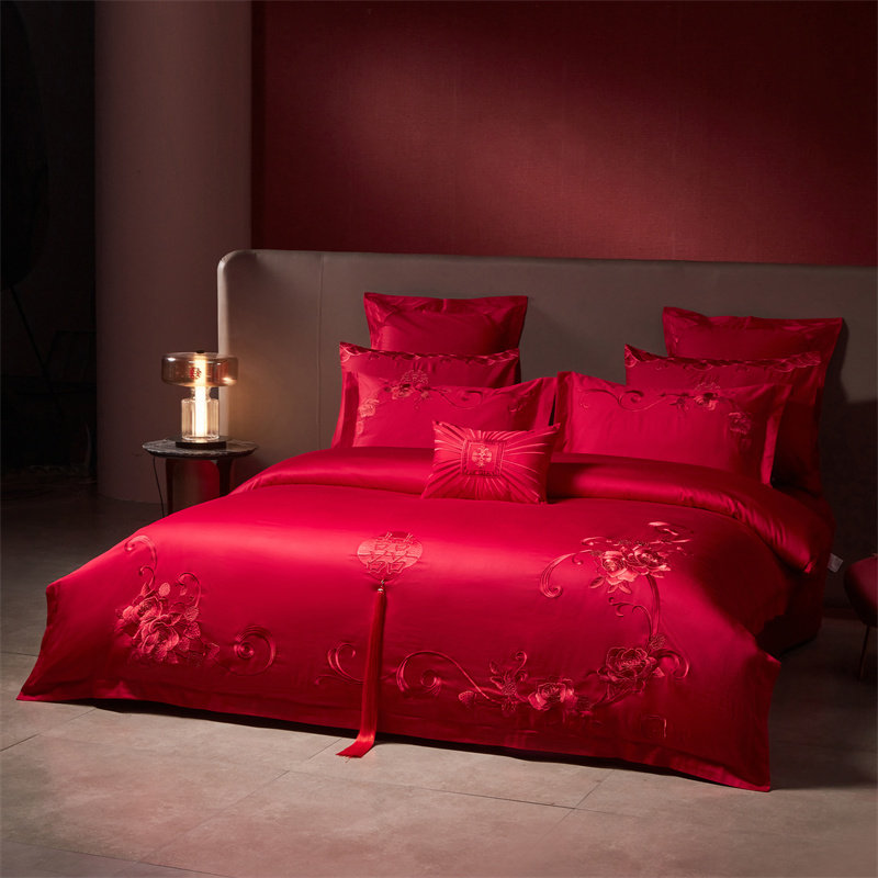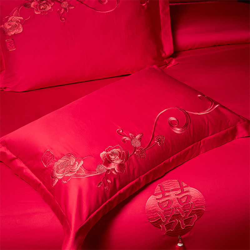法式100支长绒棉四件套婚庆纯棉刺绣被套红色喜庆全棉床单1.8床品