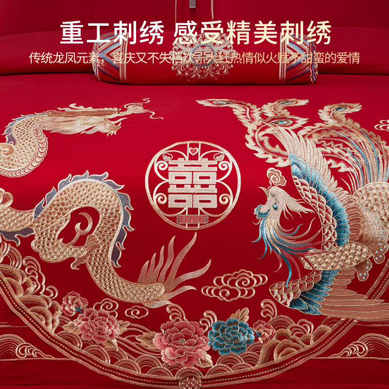 天猫结婚床上用品四件套红色婚庆纯棉全棉龙凤刺绣被套高级感新婚婚房