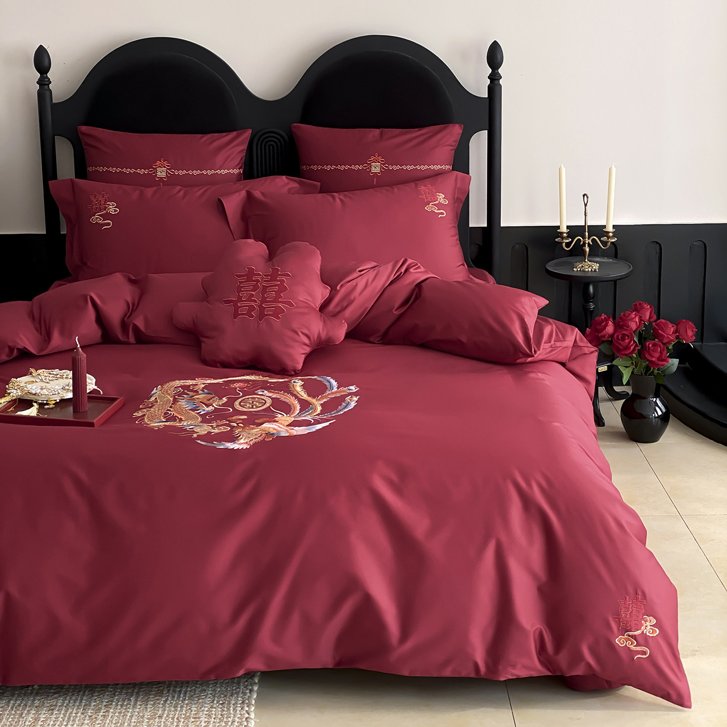 法式100支长绒棉四件套婚庆纯棉刺绣被套红色喜庆全棉床单1.8床品