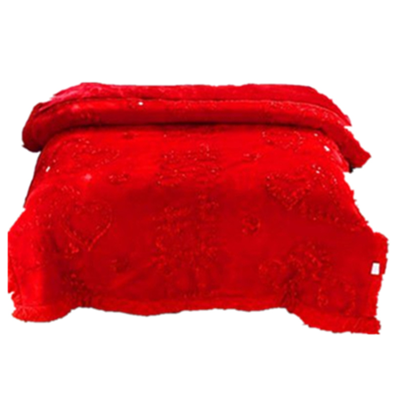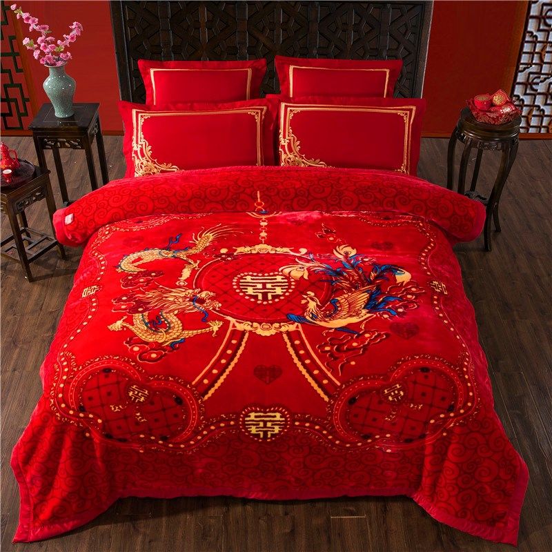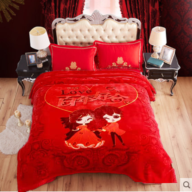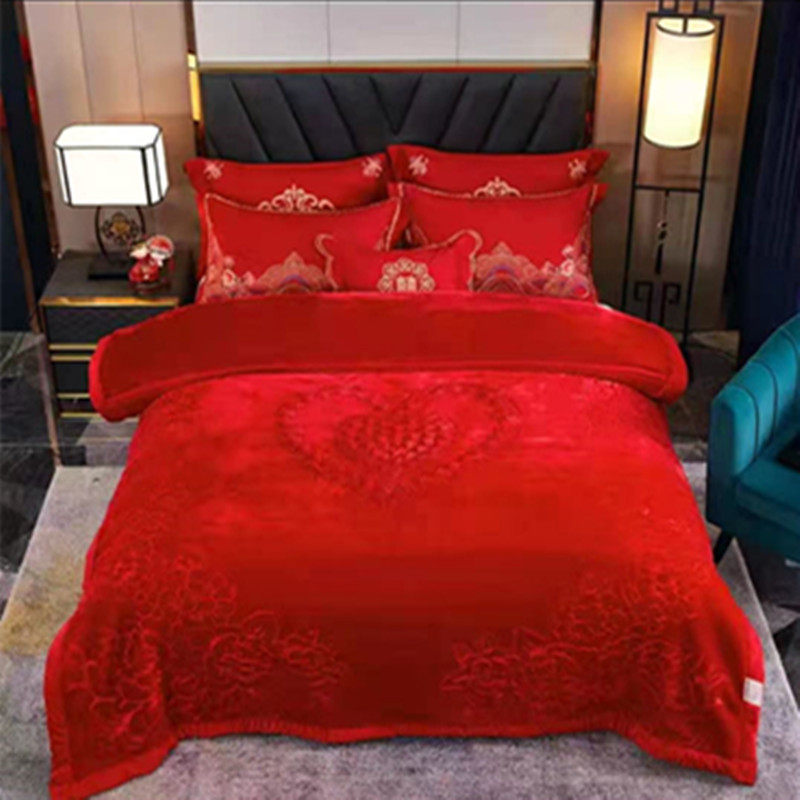 淘宝婚庆拉舍尔毛毯结婚喜被陪嫁大红色压花喜字双层双人加厚冬季床品