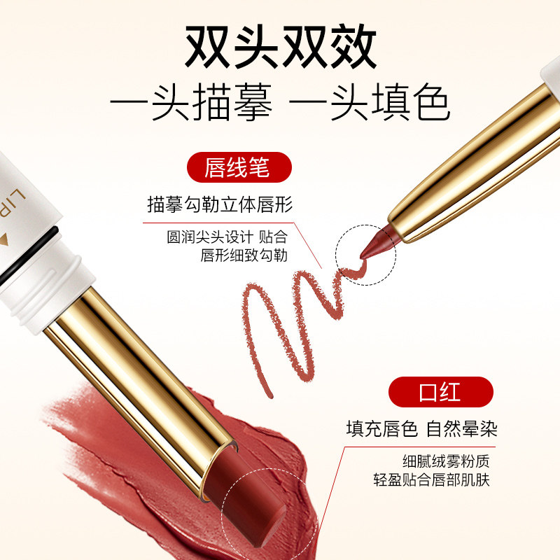 【雾感嘟唇】双头口红唇线笔,集唇线勾勒与唇妆上色于一体,轻松打造立体嘟唇效果。一端精细唇线笔精准描边,防止晕染;另一端哑光口红饱满上色,雾感质地高级显色,持久不沾杯、不掉色。蕴含保湿滋润成分,上唇不拔干,触感柔滑,长效锁水。防水配方加持,日常喝水、用餐均无惧脱色。多色可选,显白提气色,轻松驾驭各种场合。无论是通勤还是约会,一抹即现精致唇妆,持久绽放迷人魅力,是打造持久哑光唇妆的必备神器。
