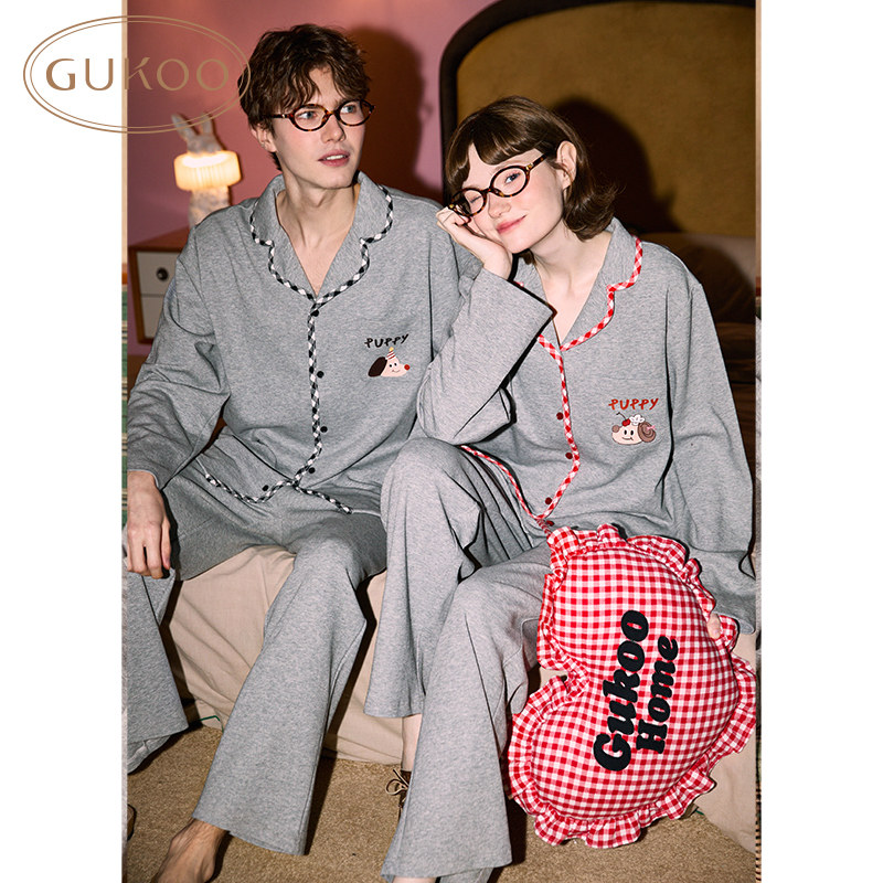 天猫Gukoo/果壳睡衣女春秋款长袖轰轰小狗全棉舒适情侣家居服套装