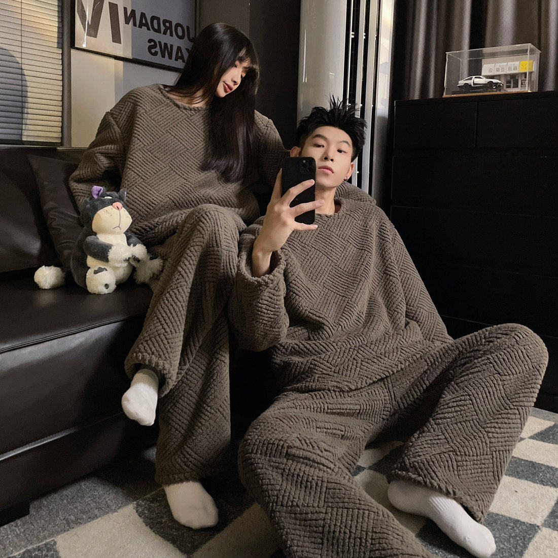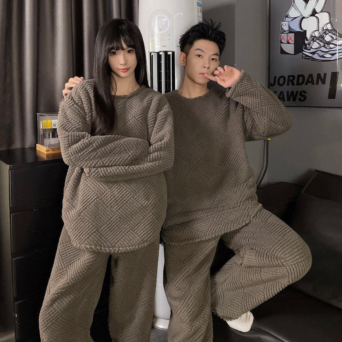 淘宝情侣睡衣女冬季珊瑚绒加厚加绒简约韩版可外穿男士套头家居服套装