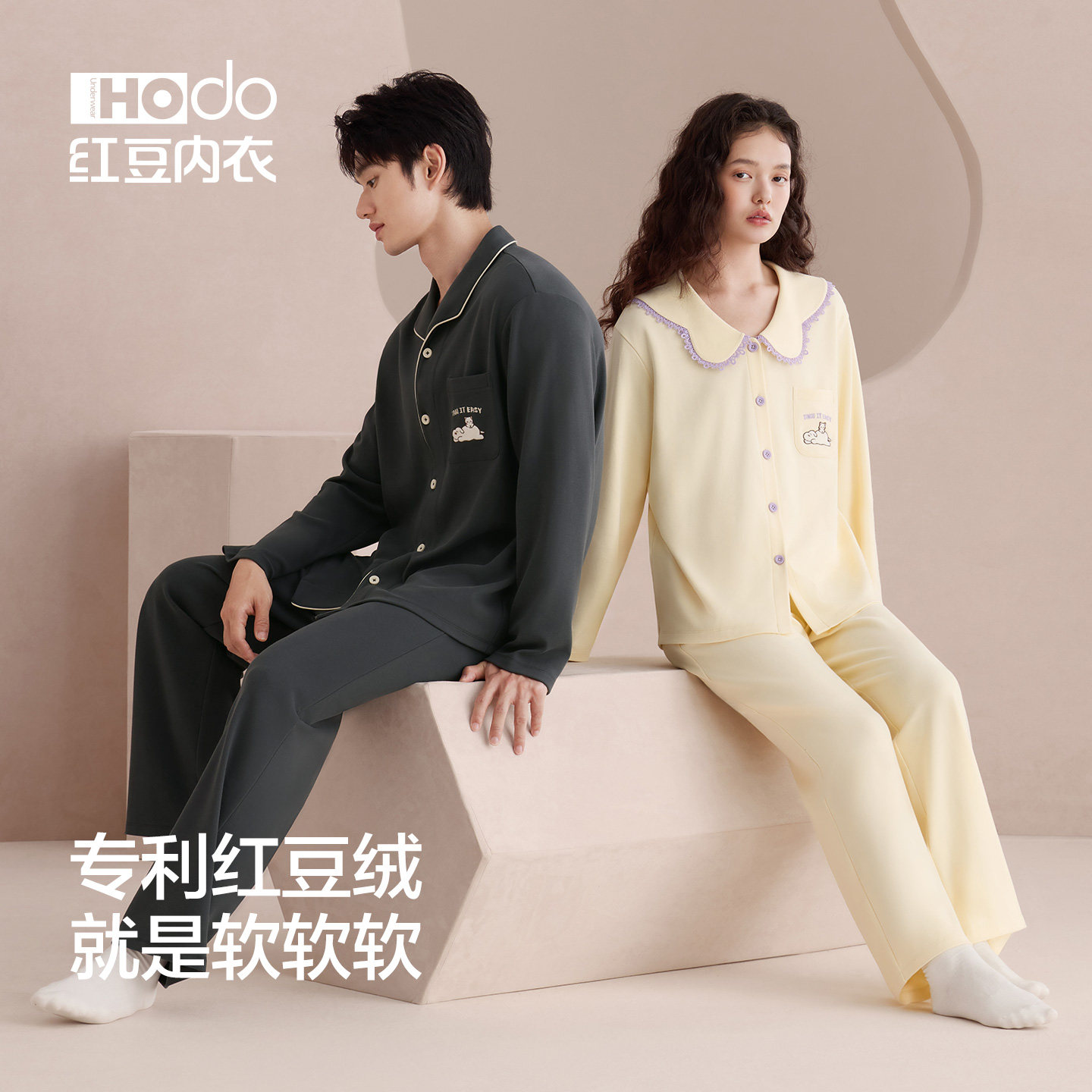 天猫红豆情侣睡衣柔棉长袖男女磨毛A类春秋宽松中厚蝴蝶领家居服套装