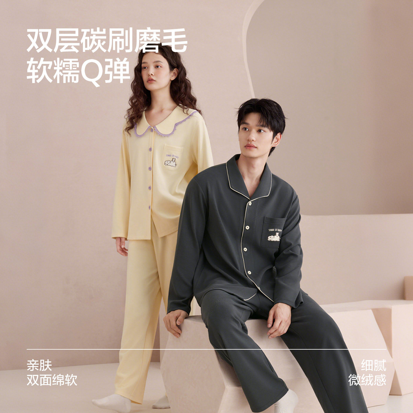 淘男士睡衣秋季纯棉磨毛绒布情侣女士秋冬简约高级感长袖家居服套装