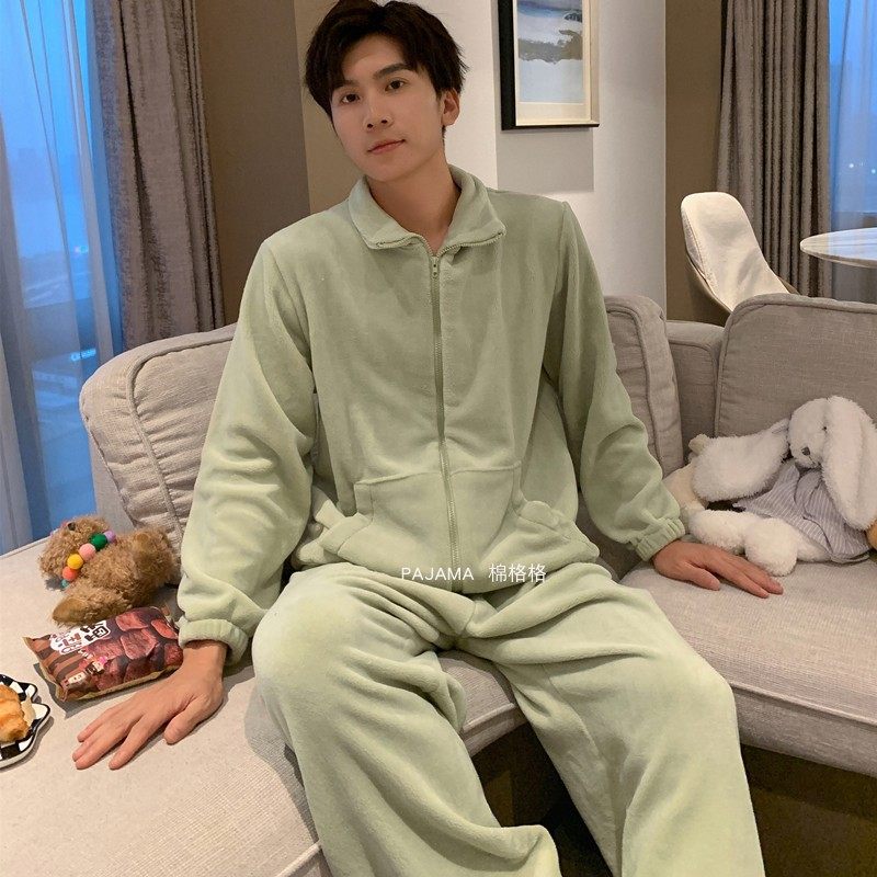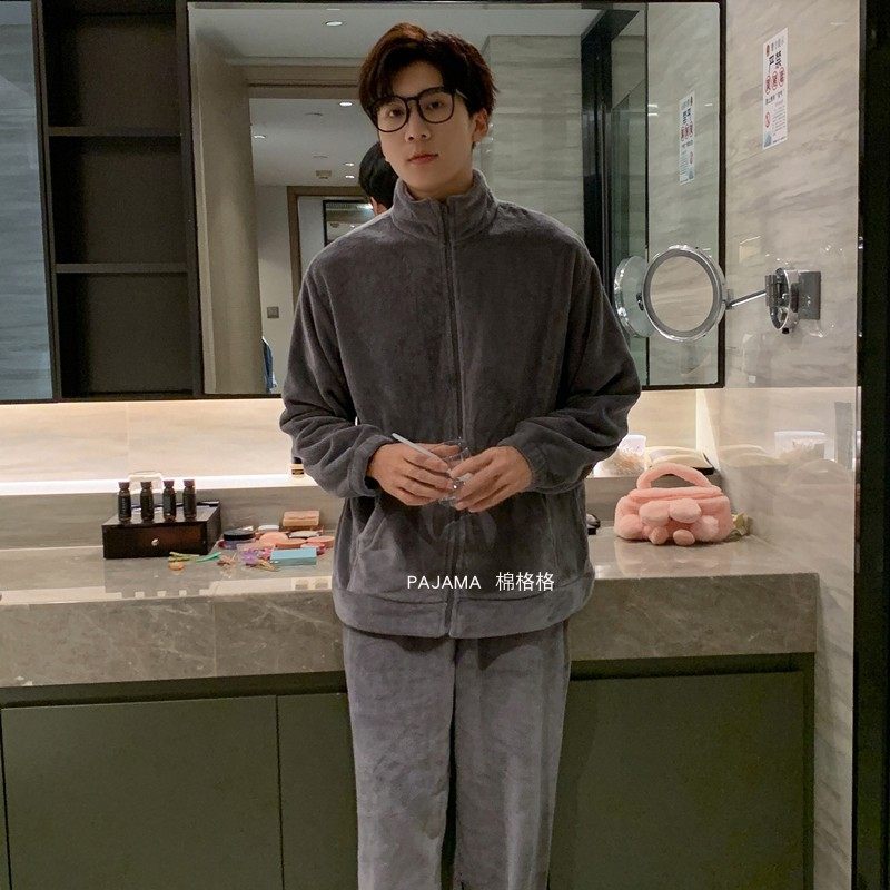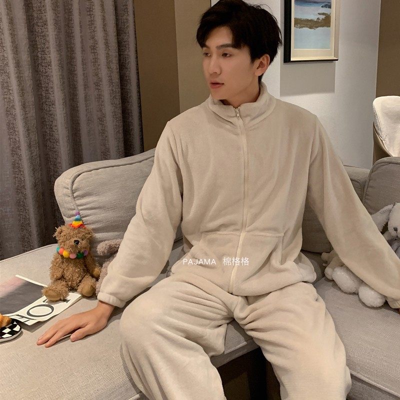 【双层加厚】睡衣秋冬季男款加绒羊羔拉链冬天珊瑚绒情侣家居服女