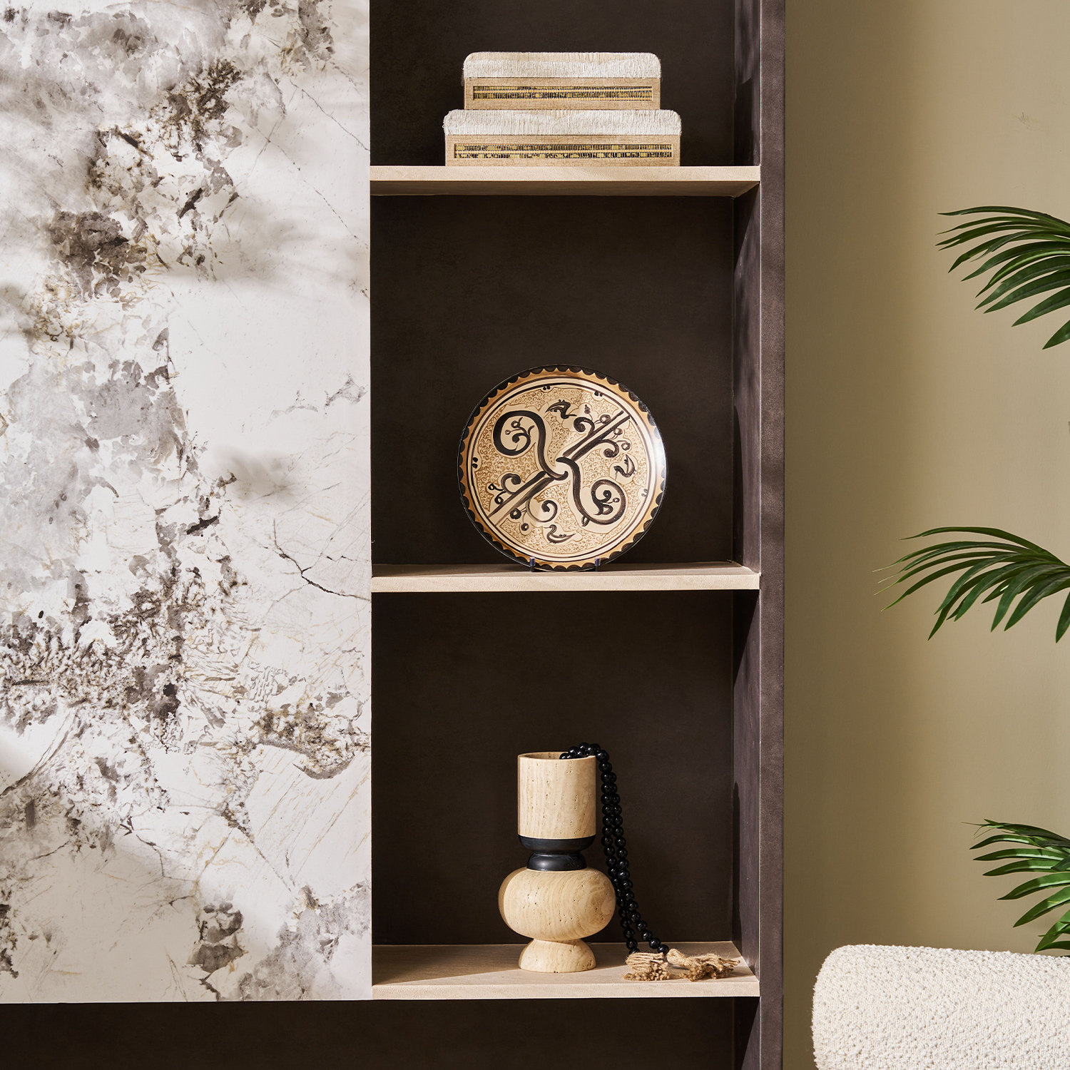 本现代风轻奢样板房客厅电视旁的展示柜,采用意式极简设计理念,以开放格形式呈现,兼顾通透感与层次感。柜体线条利落,材质选用高级哑光烤漆与金属边框搭配,凸显低调奢华。开放格内精心陈列工艺装饰品与意式极简摆件,如抽象雕塑、陶瓷器皿与金属几何装置,色彩以中性灰、暖白与古铜为主,和谐统一。灯光嵌入柜体边缘,柔和光线勾勒出器物轮廓,营造静谧而高级的氛围。整体设计既满足展示功能,又成为空间艺术焦点,彰显居者不凡品味与生活美学追求。