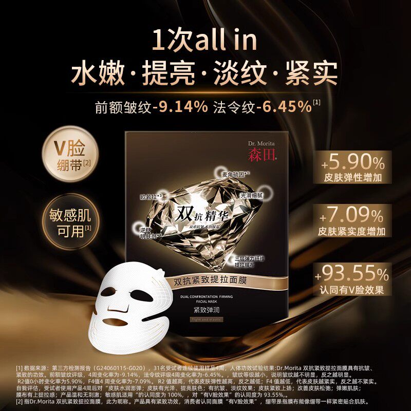 森田双抗紧致提拉面膜,专为熬夜肌与初老肌设计,融合烟酰胺与多重胜肽核心成分,实现“双抗”功效——抗皱淡纹、提亮焕肤。独特V脸提拉膜布贴合面部轮廓,有效紧致下颌线,改善肌肤松弛。富含透明质酸与神经酰胺,深层补水保湿,持久滋润干燥暗沉肌,缓解熬夜带来的倦容与细纹。温和配方,适合多种肤质长期使用。每周使用2-3次,肌肤更显紧致饱满、透亮有光泽,轻松打造年轻V脸,是日常抗初老与急救护理的理想之选。