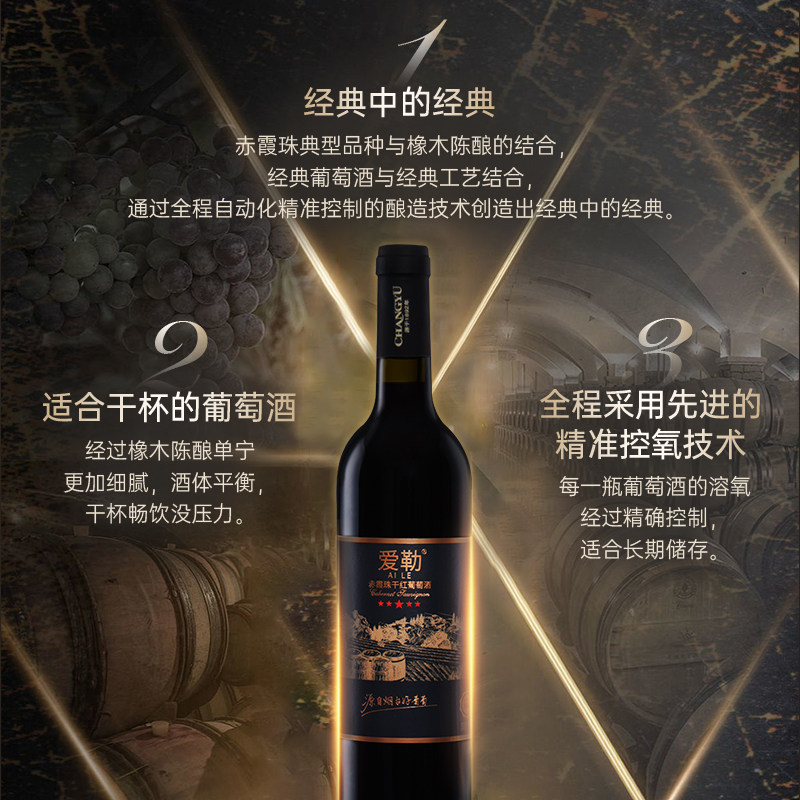 张裕橡木桶陈酿五星版爱勒赤霞珠干红葡萄酒精选优质赤霞珠葡萄,经法国橡木桶精心陈酿,酒体醇厚,结构平衡。酒液呈深邃宝石红色,散发黑醋栗、黑莓的浓郁果香,伴随香草、雪松和淡淡的烟熏气息,口感柔顺而富有层次,单宁细腻,余味悠长。750ml装×6瓶圆筒礼盒装,设计典雅大气,既适合家庭聚餐、商务宴请,也是节日馈赠的佳品。作为中国葡萄酒的标杆品牌,张裕以百年匠心工艺,呈现这款兼具国际品质与东方韵味的干红佳酿,是品味生活、享受品质的不二之选。