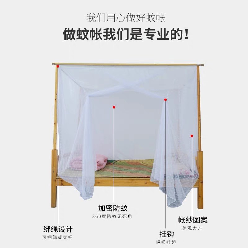 这款家用蚊帐采用传统老式设计,单门进出,搭配穿杆结构,稳固耐用。精选加厚加密面料,有效防蚊的同时具备良好的防尘、透气性能,顶部采用方顶梅花图案装饰,美观大方。适用于1.2米、1.5米、1.8米床型,适配性强。帐顶加高设计,空间更宽敞,避免压抑感。安装简便,无需复杂工具,轻松撑起即可使用。整体结构结实,垂感佳,长期使用不易变形。无论是夏季防蚊还是日常防尘,都能提供舒适安心的睡眠环境,是家庭实用的经典之选。
