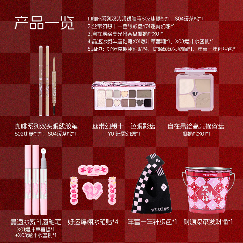 天猫VEECCI/唯资财源滚滚发财桶彩妆套装送女友彩妆礼物眼线胶笔口红