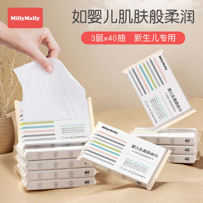 天猫米莉马莉40抽*10包婴儿乳霜柔纸巾母婴专用柔润云柔巾宝宝湿纸巾