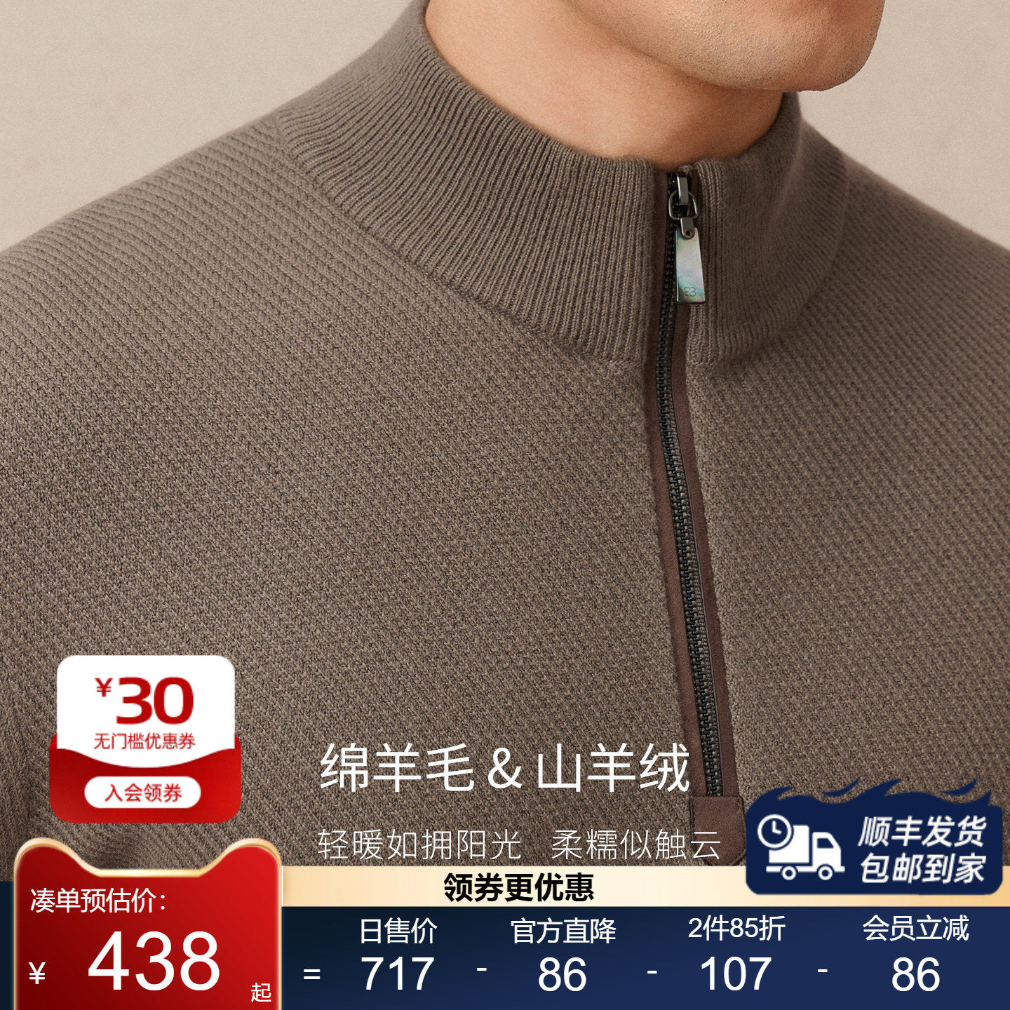 天猫堡尼秋冬新品商务高领拉链毛衣修身羊绒羊毛衫针织衫男JQ638232B