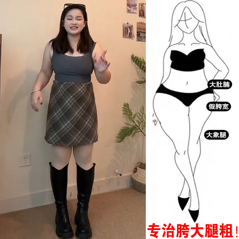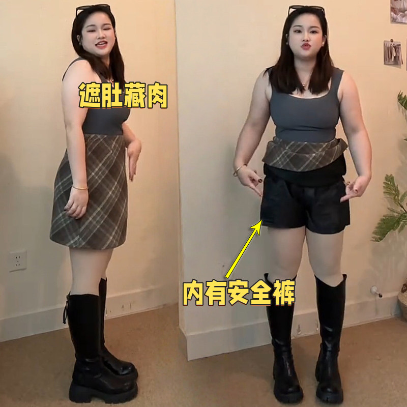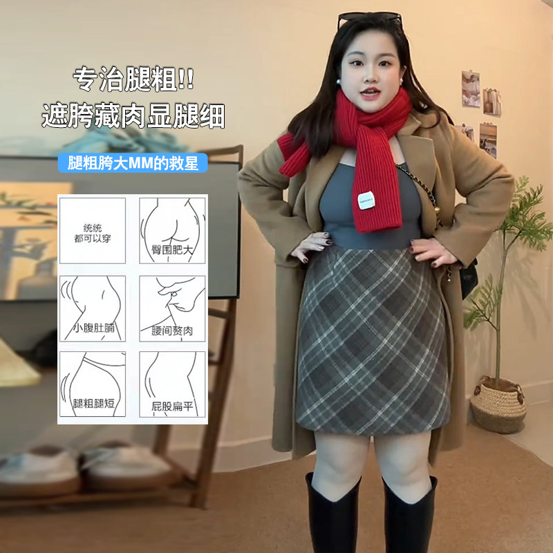 淘宝大码梨型身材毛呢半身裙秋冬复古格子高腰显瘦小个子遮肉包臀短裙