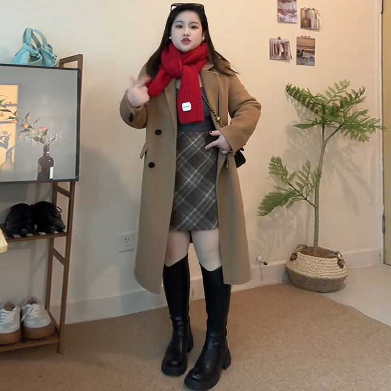 天时然大码微胖MM2025冬新款格子半裙中长款A字高腰条纹呢料半身裙