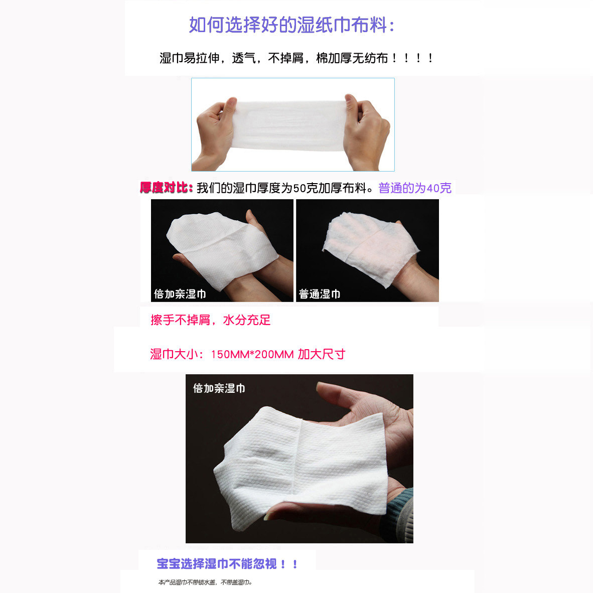 倍加亲湿巾专为新生儿及婴幼儿设计,每包100抽(80片常规装+20片加量装),贴心配备密封盖,有效锁水防干,持久保持湿巾柔软湿润。采用优质无纺布材质,触感细腻亲肤,不含酒精、香精、荧光剂等刺激性成分,温和洁净,适合宝宝娇嫩肌肤。特别适用于手口清洁、臀部护理及日常护理,安全无刺激。包装便携,居家外出皆宜。现支持全国包邮批发,量大从优,是母婴店、代购及家庭囤货的理想选择。倍加亲,用心守护宝宝每一寸肌肤,让清洁更安心、更便捷。