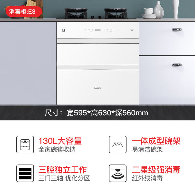 樱花E3家用嵌入式消毒柜,拥有130升大容量设计,轻松容纳全家餐具,满足日常消毒需求。采用紫外线+高温双重杀菌技术,高效灭杀大肠杆菌、金黄色葡萄球菌等常见病菌,守护家人健康。嵌入式安装节省厨房空间,美观实用,适配多种橱柜风格。内置分层碗架,合理分区,碗筷摆放井然有序。智能触控面板操作简单,支持多档定时消毒,节能省电。全封闭密封设计,有效防止二次污染。樱花E3消毒柜以安全、高效、便捷为核心,为现代家庭打造洁净健康的用餐环境,是厨房健康生活的理想之选。
