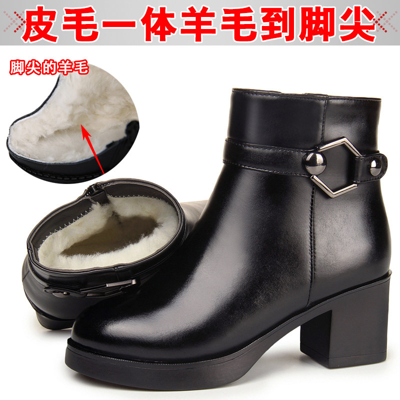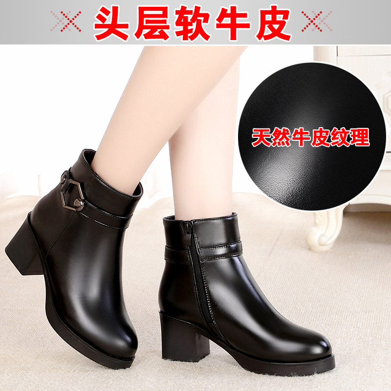 天猫真皮靴子短靴女冬季加绒高跟妈妈棉鞋粗跟防滑加厚羊毛中老年皮鞋