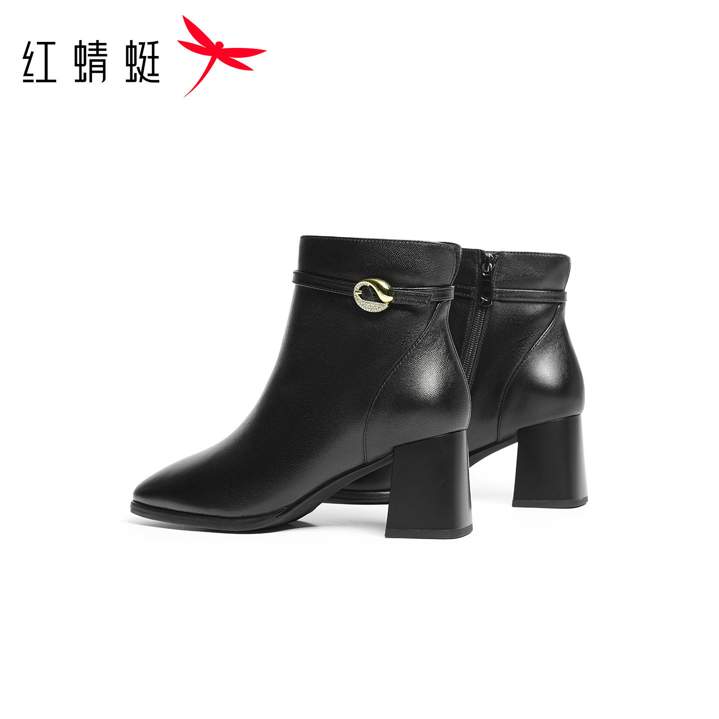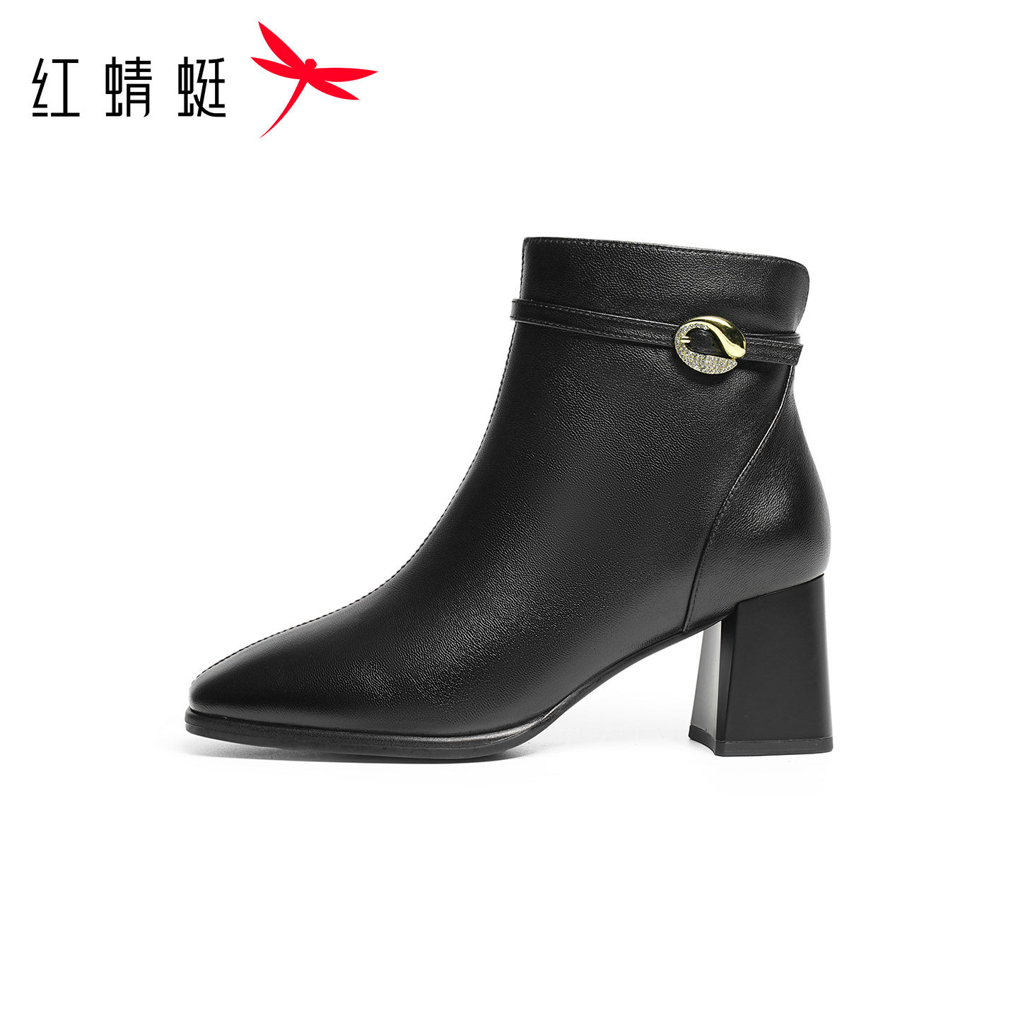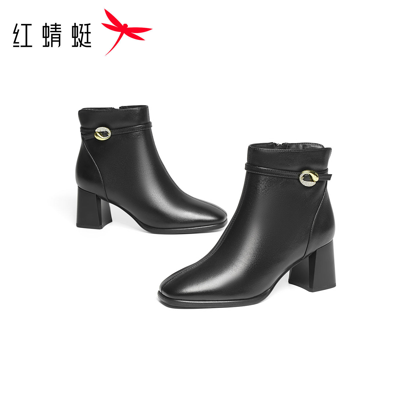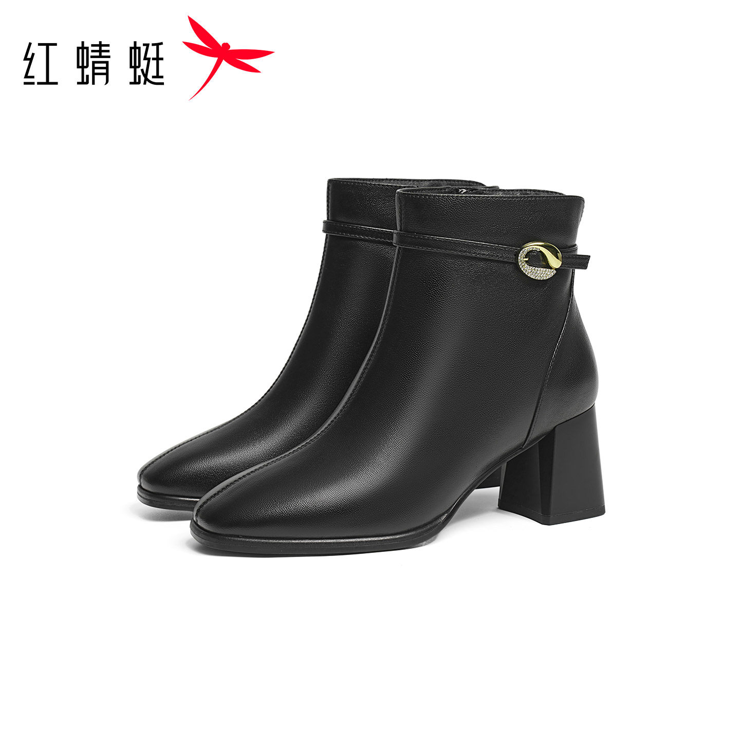 天猫红蜻蜓高跟皮鞋女妈妈款短靴秋冬季新款女鞋羊皮加绒保暖粗跟靴子