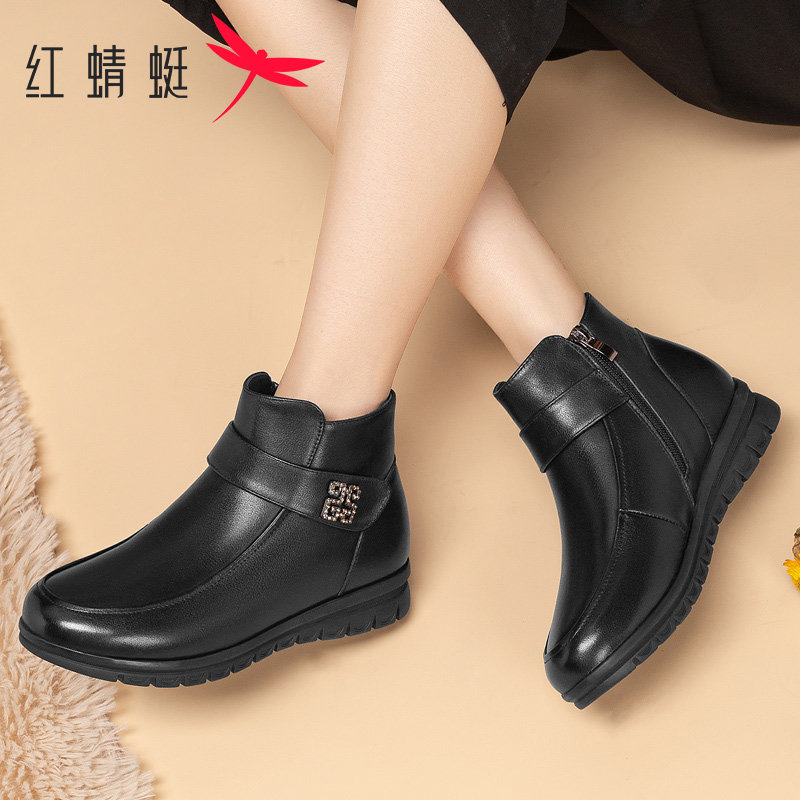 天红蜻蜓坡跟妈妈鞋子冬季新款女鞋真皮加绒保暖皮鞋女款中老年棉鞋