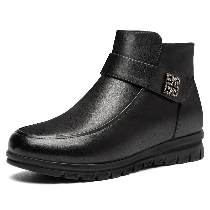 天真皮靴子短靴女冬季加绒高跟妈妈棉鞋粗跟防滑加厚羊毛中老年皮鞋