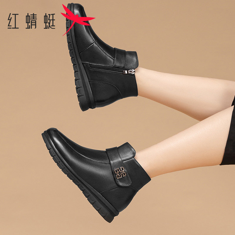 天猫红蜻蜓女鞋2025冬季真皮加绒保暖短靴女软底防滑妈妈鞋中老年棉鞋