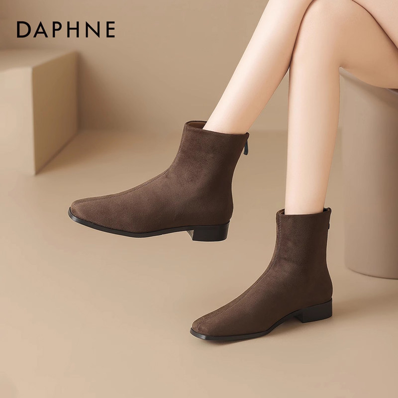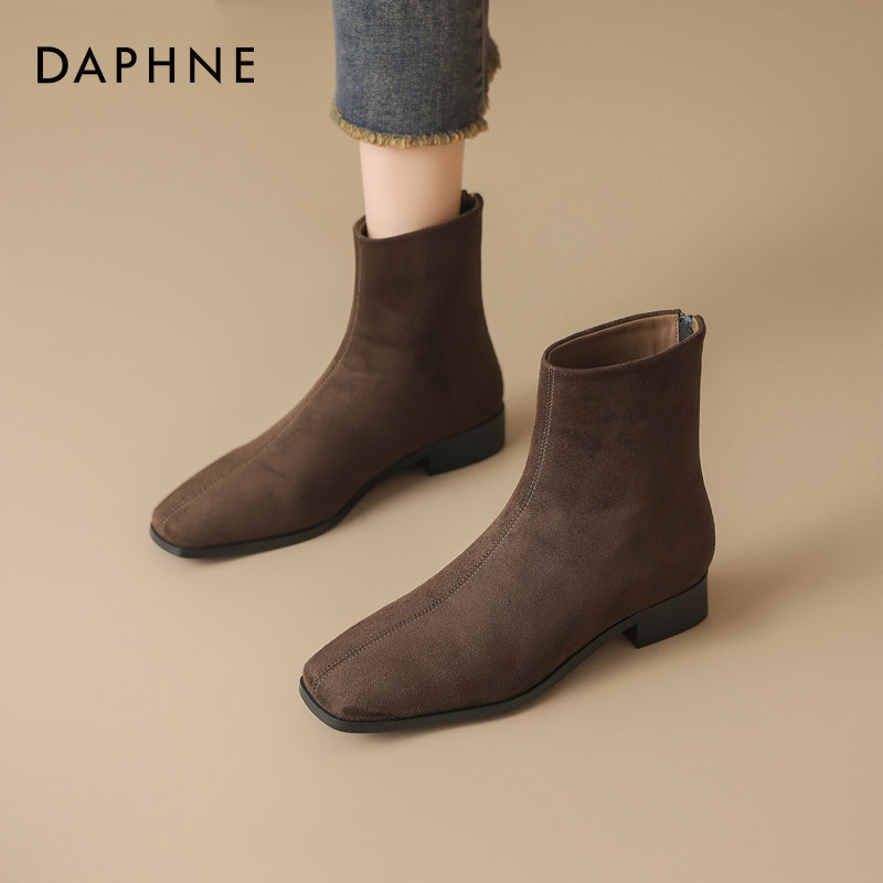 天猫达芙妮绒面短靴女2025新款冬季弹力瘦瘦靴加绒袜靴平底法式妈妈鞋