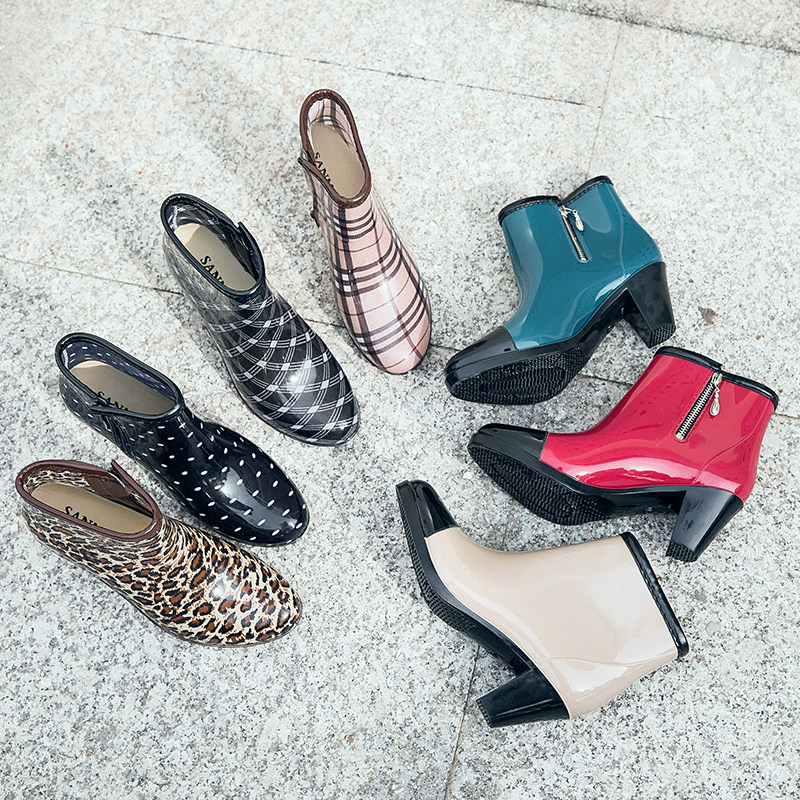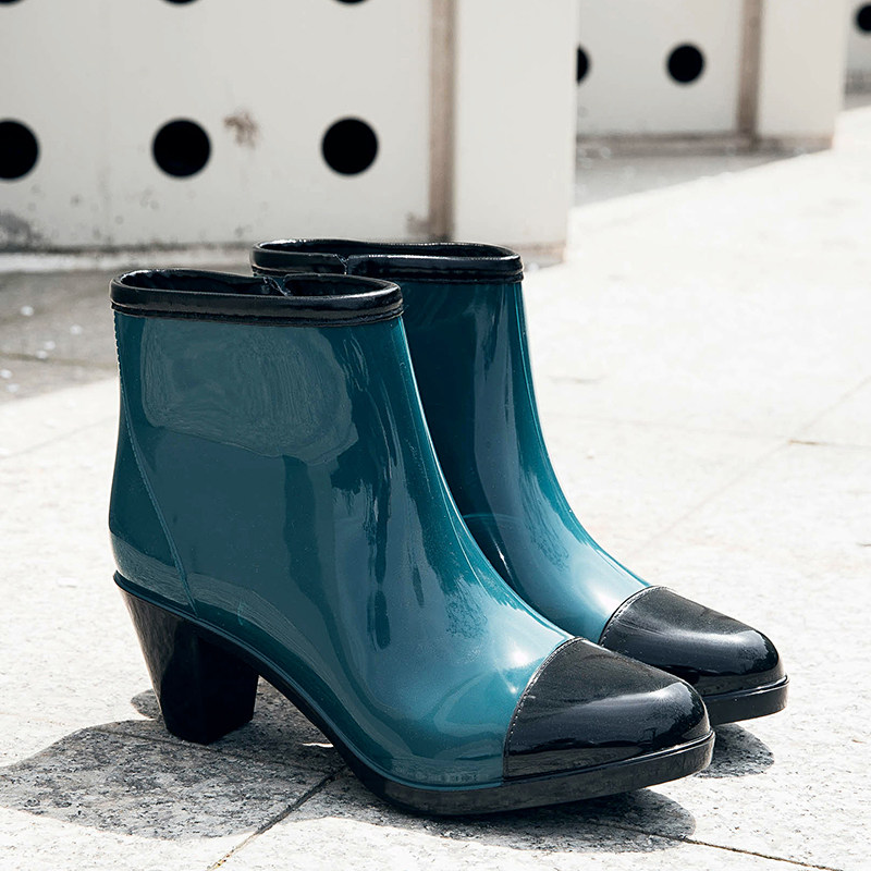 淘宝时尚雨靴女短筒侧拉链高跟防水胶鞋防滑雨鞋女鞋拼色时尚百搭尖头