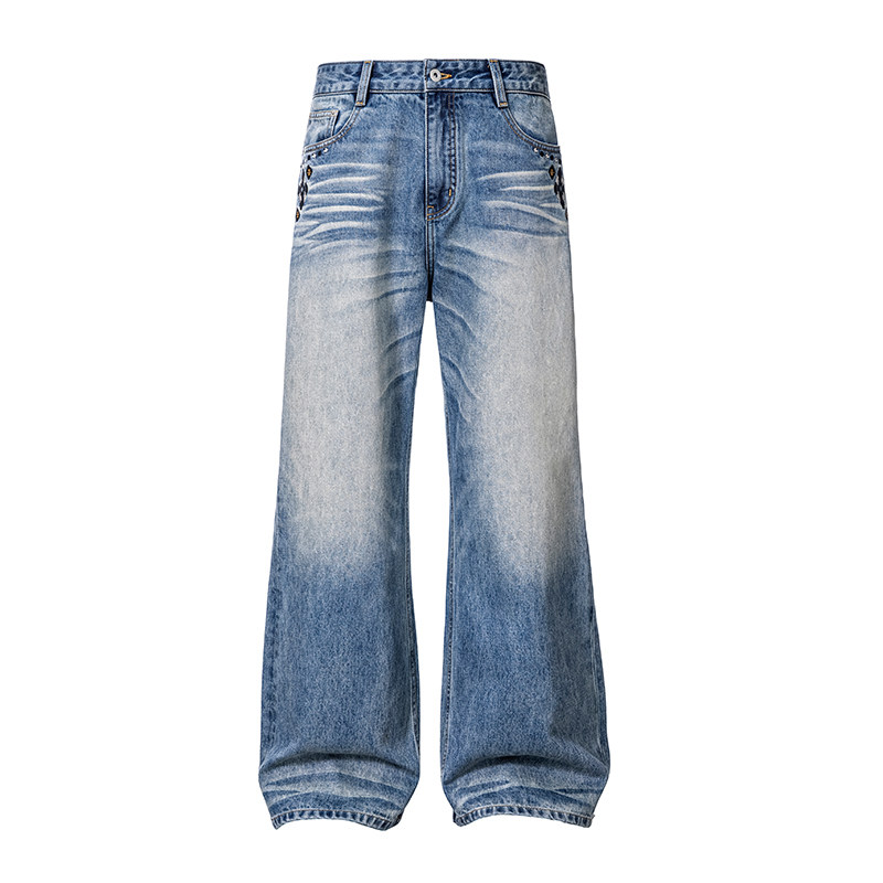 WASSUP阔腿蓝色牛仔裤男款春秋季潮牌宽松裤子水洗复古高街长裤子