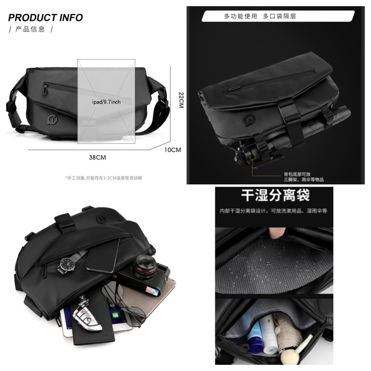 这款男士斜挎包是专为都市通勤与户外活动设计的新款潮流胸包,融合时尚与实用。采用高密度防水面料,有效抵御雨水侵袭,适合骑行、机车出行及日常通勤。轻量化设计搭配可调节肩带,可斜挎、单肩或胸前背负,解放双手,提升出行便利性。多隔层收纳结构,轻松容纳手机、钱包、耳机、充电宝等随身物品,安全有序。简约大气的外观搭配撞色织带与金属扣件,彰显运动型男个性风格。无论是城市穿梭还是周末出游,这款多功能背包都能满足你对潮流与功能的双重需求,是型格与实用兼具的理想选择。