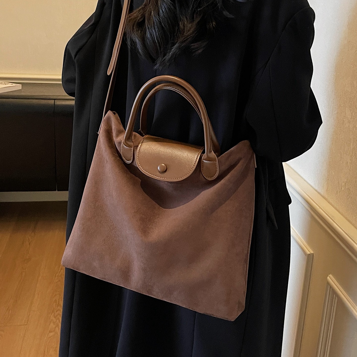 这款美拉德复古麂皮绒大包,是秋冬不可或缺的百搭单品。采用质感细腻的麂皮绒面料,触感柔软,色泽温润,完美契合当下流行的复古美学。大容量托特包设计,轻松容纳通勤所需物品,满足日常出行需求。可手提、可斜挎,多种背法随心切换,实用又时尚。简约廓形搭配精致五金,低调中彰显品味,无论是搭配大衣、毛衣还是休闲装,都能轻松驾驭,展现慵懒随性的都市风格。是职场女性与时尚达人的理想选择,兼具美观与功能性,为秋冬造型增添一抹温暖高级感。