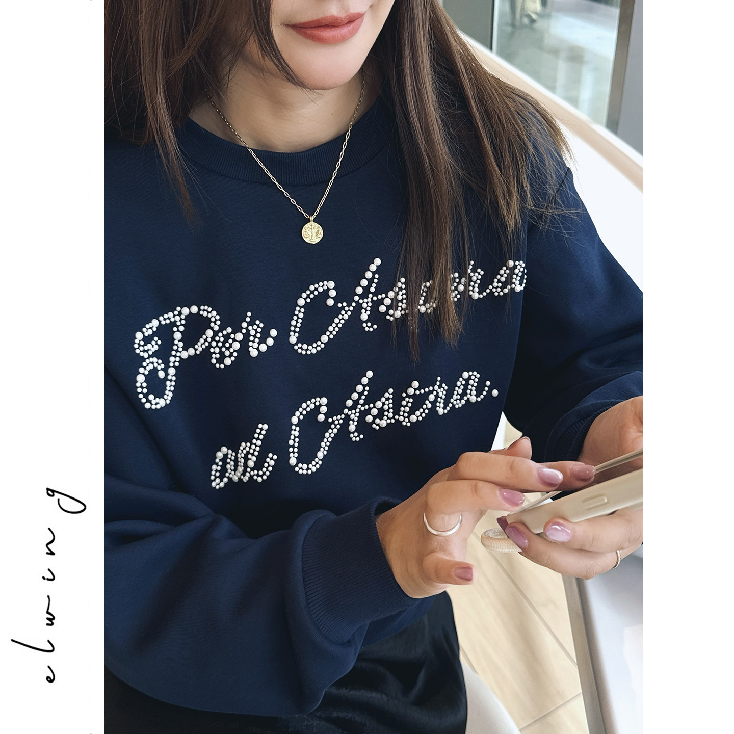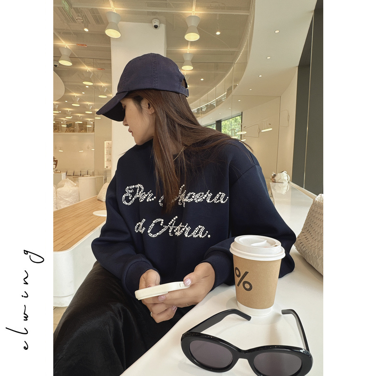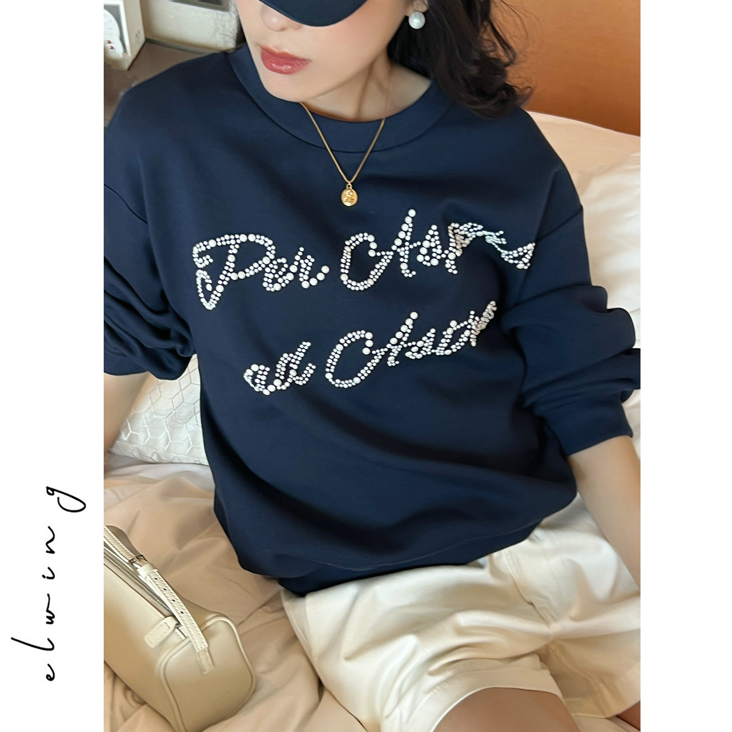淘宝Elwing原创复古珍珠烫钻圆领宽松廓形感空气棉卫衣