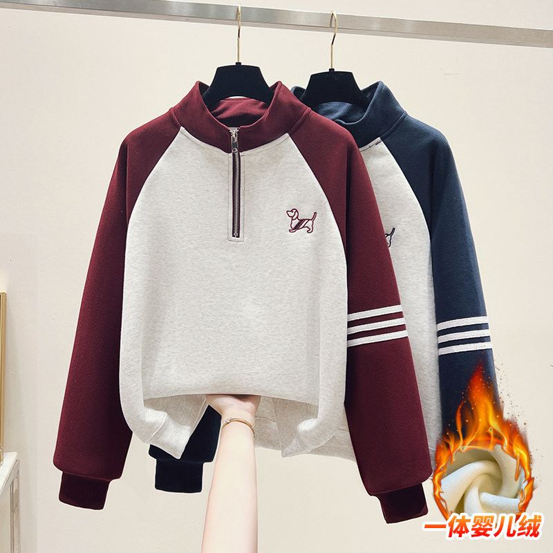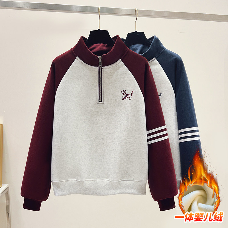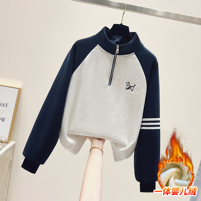 淘宝山东即墨加绒加厚纯棉立领卫衣女秋冬宽松半拉链卡通刺绣拼色上衣