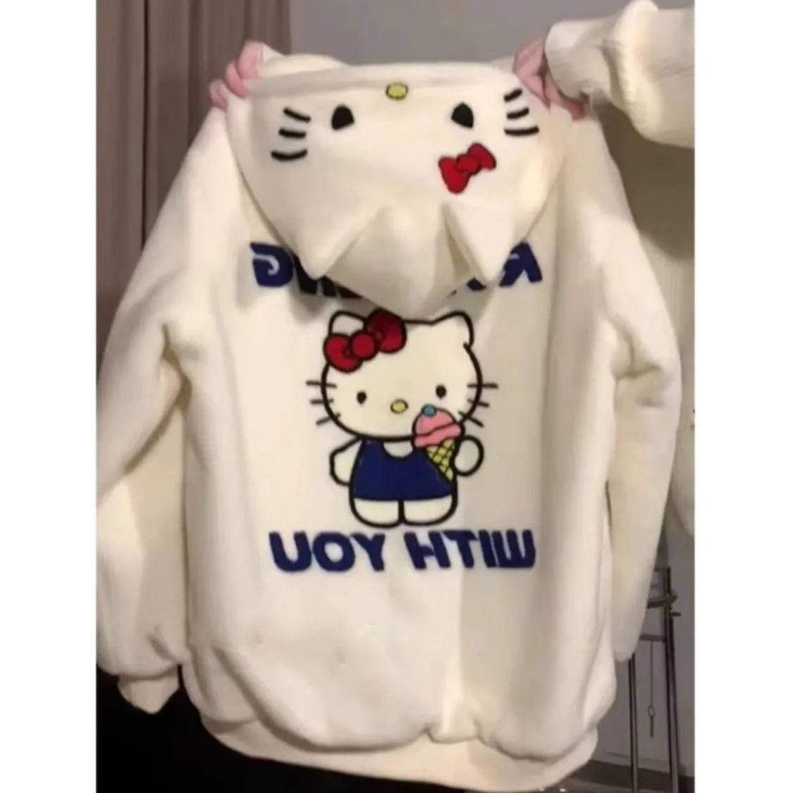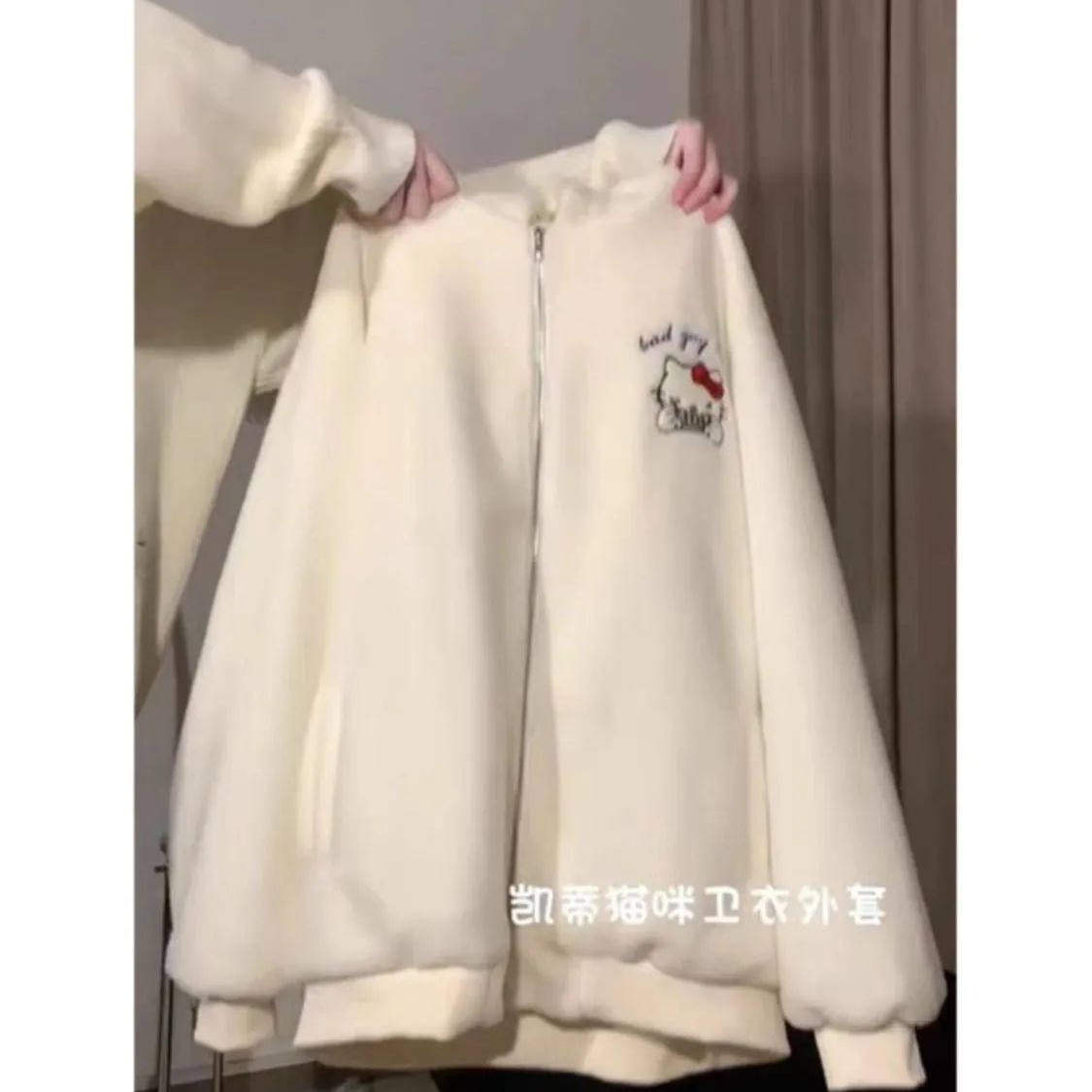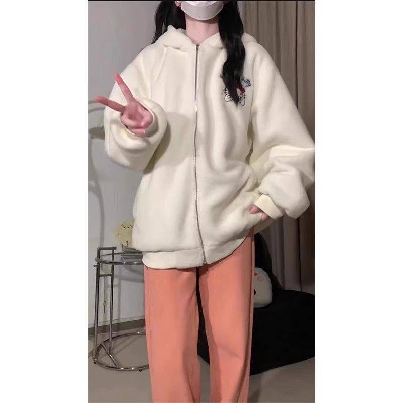 淘宝特大码300斤可爱刺绣凯蒂猫羊羔毛绒卫衣女加绒加厚开衫棉衣外套
