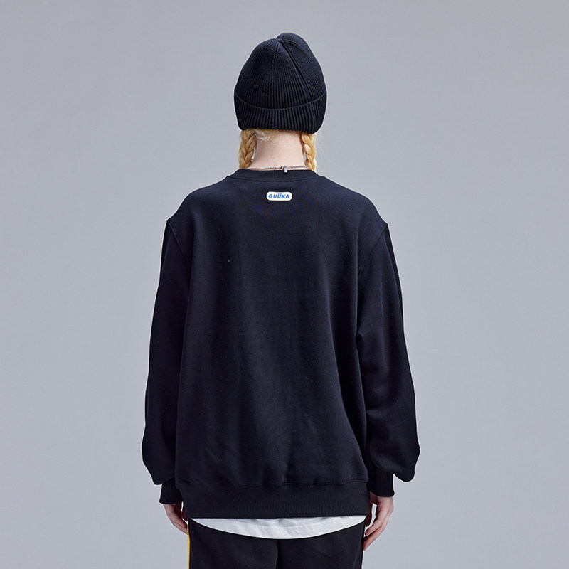 天猫GUUKA黑色圆领卫衣女春秋新款潮牌 情侣美式极简刺绣上衣oversize